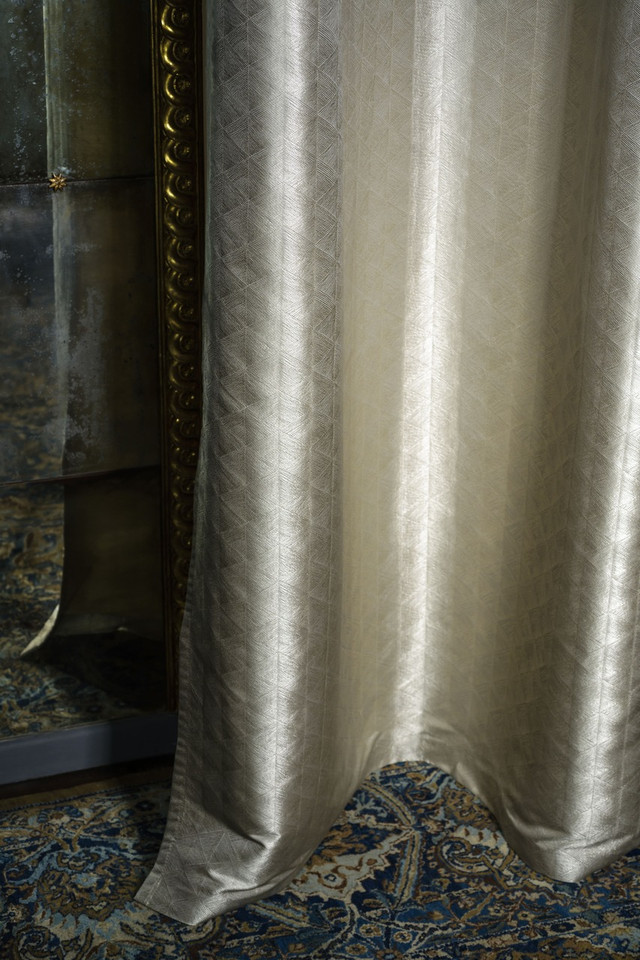 Ein Stoff, der sich aus verschiedenen Garnen zusammensetzt, die ein von Afrika inspiriertes grafisches Motiv mit Metallic-Effekt ergeben. Die leicht gewellte Oberfläche enthüllt zunächst ein verborgenes Volumen. Geeignet für die Verwendung als Vorhang und Dekoration. Finden Sie das Sortiment von DEDAR Milano online bei Villakontor.
