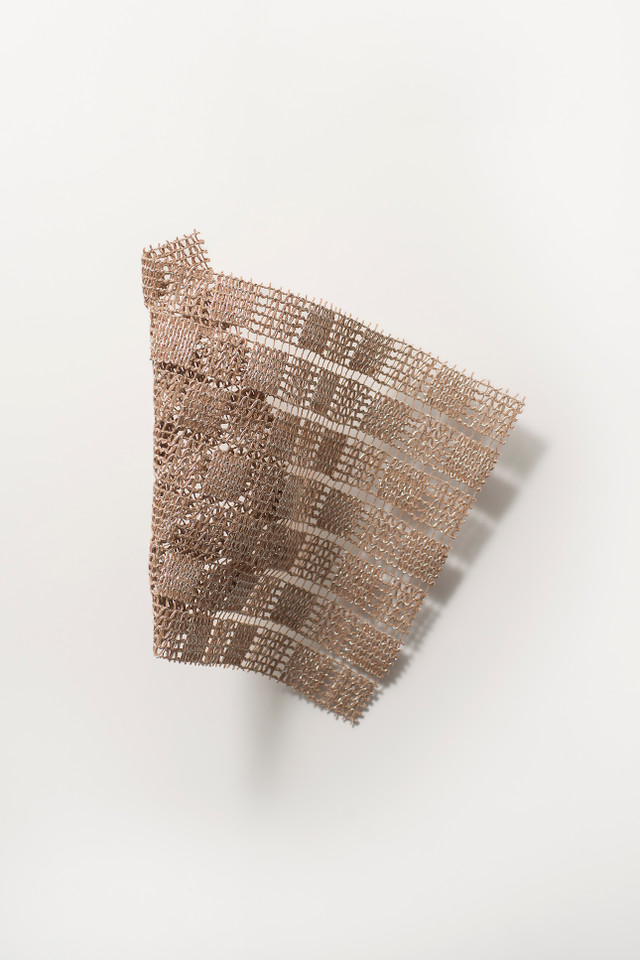 Eine aufwendige Metallhäkelei lässt eine kostbare Webkomposition dank raffiniertem handwerklichem Können Form annehmen. Die elegante Präsenz des feinen Silbergarns sowie die architektonische Struktur erinnern an Experimente der Kleideravantgarde der 1960er Jahre. Hier trifft geometrische Präzision auf die Bewegung des Garns sowie die Weichheit des Gewebes und stellt ein faszinierendes Gleichgewicht von Strenge und Fluidität her.