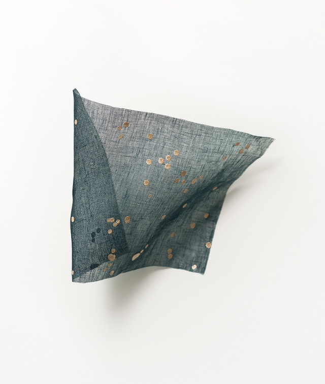 Ein großer Leinenvoile mit weichem und fülligem Faltenwurf, digital bedruckt, mit einem Degradé-Volant, der mit unregelmäßigen fühlbaren Metallic-Tropfen verziert ist, die in einem aufwendigen Heißzylinderverfahren erzeugt werden. Besonders geeignet für Vorhänge.