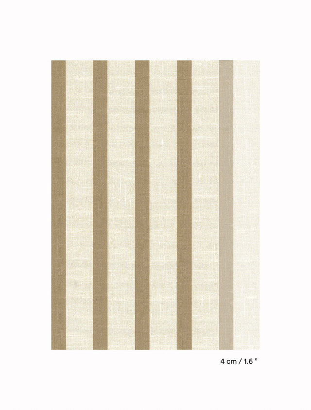 Textile Wandverkleidung aus geflammter reiner Leinengaze mit leichter und offener Bindung, belebt durch lebendige zweifarbige Digitalprint-Streifen. Das Motiv erinnert an das unbeschwerte Leben an den Stränden des nordfranzösischen Deauville und verleiht Wänden frische Farbe. Die Basis für das Printmotiv bildet die Fitzcarraldo.