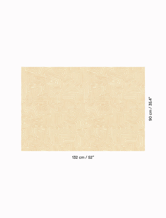 Eine Wandbekleidung aus reinem Spinnseiden-Shantung, der von Hand gefärbt und verwebt wird. Die vollmundigen und unregelmäßigen Garne offenbaren so ein einzigartiges Muster in Farbe und Textur. Die digitale Drucktechnik bringt ein labyrinthartiges Design hervor, das an uralte Gravuren erinnert, indem prähistorische narrative Zeichen und archaische Symbole zum Vorschein kommen.