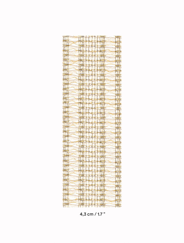 Textile Wandverkleidung, bei der Lurex- Kettgarnen mit einem bauschigen Shantung-Seidengarn verwebt werden, wodurch neue Materialkombinationen entstehen, die durch eine Dreherbindung akzentuiert werden. Metallische Lichtreflexionen und die für die Goldschmiedekunst typische Raffinesse schmücken die Wände. Auch in einer Stoffversion für die Verwendung als Vorhang erhältlich.