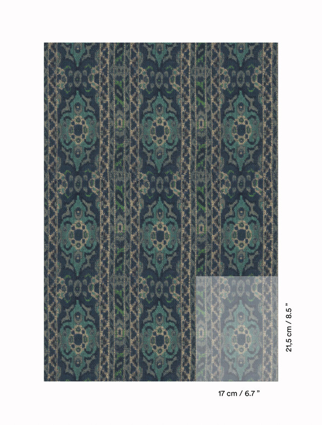 Das geometrische Motiv, das den dekorativen Details eines Orientteppichs entlehnt ist, wurde auf ein voluminöses Strukturgewebe gedruckt. Das Muster wurde zwar bezüglich Material und Technik neu interpretiert, bewahrt aber den ganzen Charme der für die indische Tradition typischen Farben und Motive. Dieser strapazierfähige und vielseitige Stoff eignet sich sowohl für Vorhänge als auch für Polstermöbel.