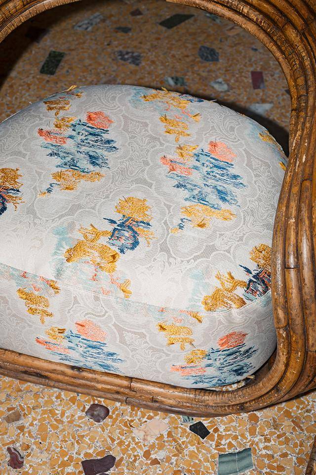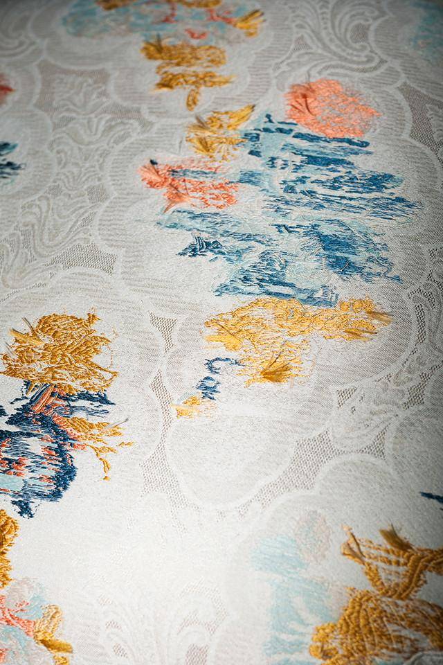 Ein weiterer Jacquard, der von den klassischen Lampasse-Geweben inspiriert wurde, diese aber ausschließlich als emotionales Erbe benutzt, auf das man zurückgreifen kann, um sich entschlossen in die Gegenwart zu versetzen. Das Blumenthema, in dem die kleinen Löwenzahnpflanzen von Kresseknospen begleitet werden, kommt als Spur zum Vorschein, auf der man ein raffiniertes und innovatives Muster mit den Farben und der Technik des Fil-Coupé schaffen kann . Das chromatische Gewebe mit Kettfaden aus Seide und Schussfaden aus Polyestee ist für die Dekoration und als Vorhangsstoff geeignet. Mehr als hundert Fäden pro cm Schussfaden.