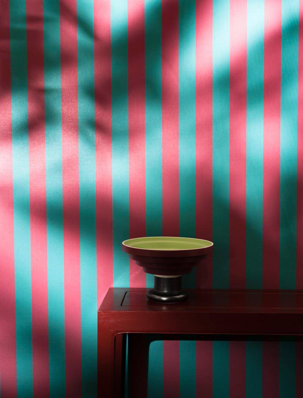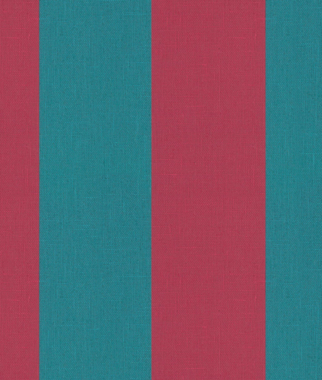 Ein textiler Wandbelag aus reiner Leinengaze mit leichter und offener Webart wird durch kühne zweifarbige Streifen im Digitaldruck belebt. Die breiten Streifen spiegeln die Welt der Sportuniformen wider, und das Leinengewebe verleiht den Wandoberflächen Textur. Die Druckgrundlage dieser Tapete ist Fitzcarraldo.