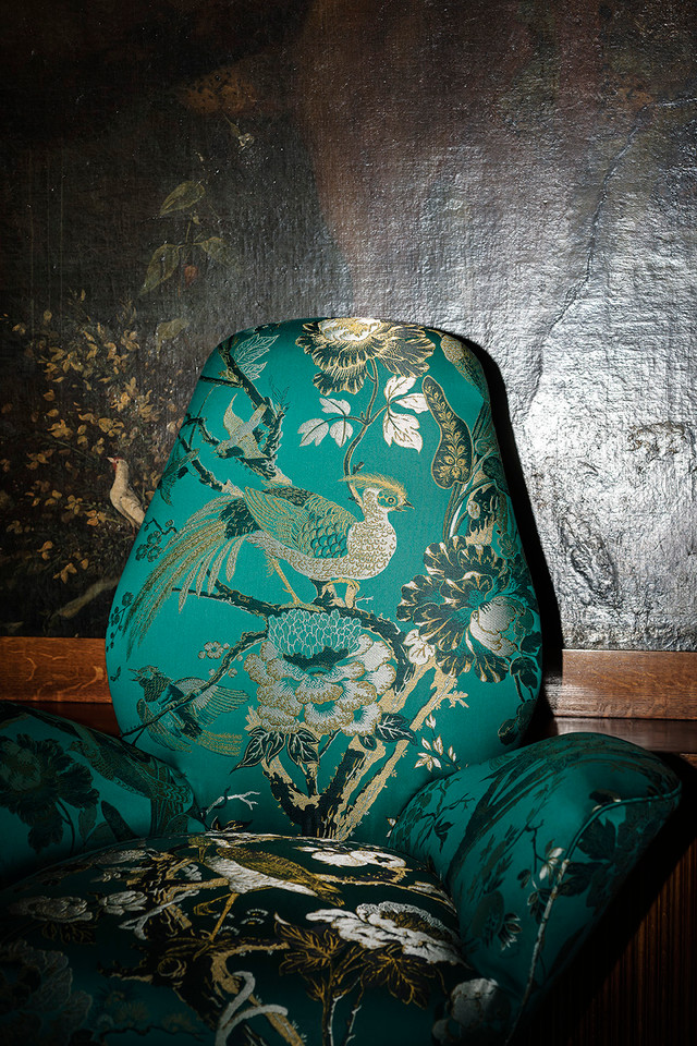 Ein Lampas mit orientalischem Motiv, das von einem Dessin aus dem Archiv stammt und in seiner textilen Interpretation eine Hommage an die Gestaltung der Coromandel ist, die chinesischen Paravents, die im Europa des 17. und 18. Jahrhunderts en vogue waren. Der farbliche Ausdruck erinnert an den Glanz von Lacken, Edelsteinen, Metallen und orientalischem Porzellan.