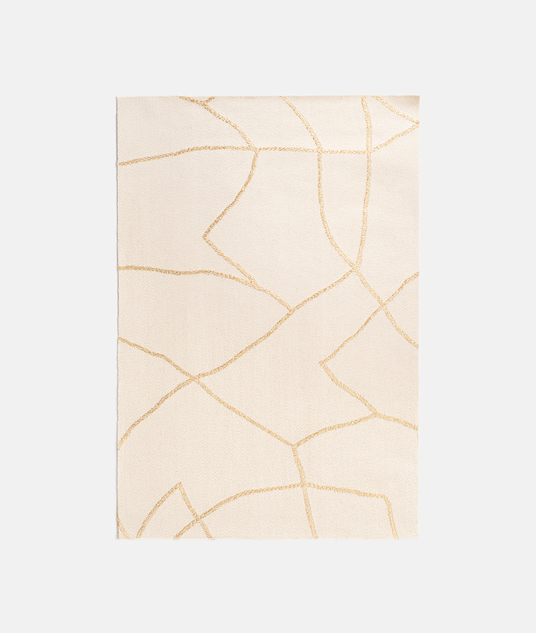 Ein raffinierter garngefärbter Jacquard mit Riss belebt einen glatten Seiden- und Wollsatin in gedämpften Farben. Zwischen Tradition, Schmuck und kostbarer Natur ist er eine zeitgenössische und stilisierte Anspielung auf prächtige antike Lampas, und darf sich einer metallischen Textur und Lichteffekten auf einem farbenfrohen Satin rühmen. Die Unvollkommenheit der farbenfrohen Zeichnungen erinnert an die alte Kunst des Kintsugi, die Brüche in der Materie in ästhetische Elemente verwandelt. Mit seinem vollen und fließenden Fall ist er wunderbar als Vorhangstoff geeignet.