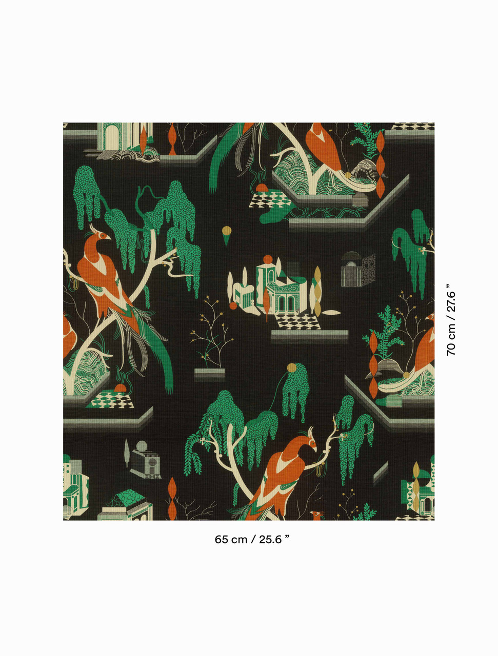 Eine paradiesische Landschaft, gezeichnet vom Illustratorenduo Icinori, wird im Siebdruckverfahren auf eine Leinwand aus reinem Leinen übertragen. Das Motiv nimmt dank einer Abfolge von mehr als zehn präzise ausgeführten Schritten Gestalt an.