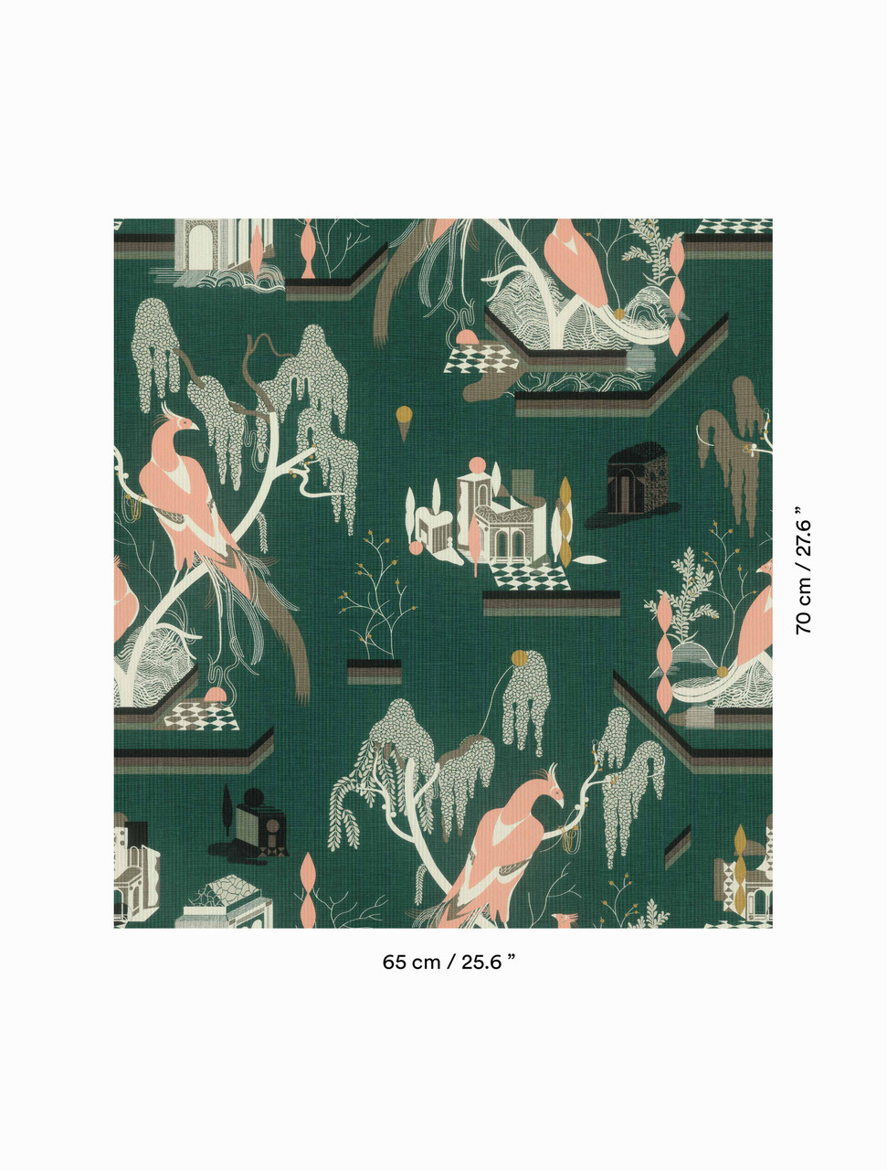 Eine paradiesische Landschaft, gezeichnet vom Illustratorenduo Icinori, wird im Siebdruckverfahren auf eine Leinwand aus reinem Leinen übertragen. Das Motiv nimmt dank einer Abfolge von mehr als zehn präzise ausgeführten Schritten Gestalt an.