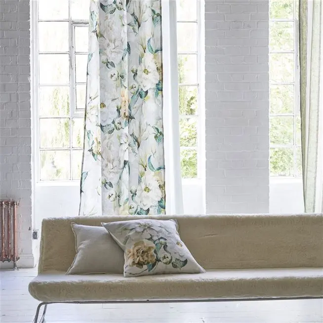 Jardin Botanique Grande von Designers Guild - große, malerische Rosenkamelien und Blätter tummeln sich auf einem zarten kreidigen Untergrund, der an die Zartheit von feinstem Porzellan erinnert. Das Muster wurde digital auf reines Leinen gedruckt. Perfekt für spektakuläre Vorhänge, Kissen und Jalousien. In zwei verschiedenen Farben erhältlich und zudem als Tapetendesign verfügbar.