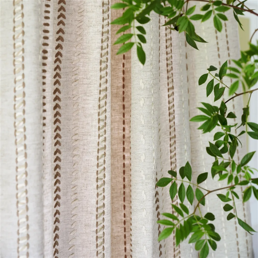 Panier Tressé von Designers Guild ist ein anspruchsvoller Interieurstoff für Vorhänge, Jalousien und Kissen, der natürliche Materialien harmonisch mit dekorativer Ausdruckskraft verbindet. Die Basis aus 80% Viskose und 20% Leinen sorgt für eine weiche, angenehme Textur mit einem natürlichen, matten Finish. Die gestickten, vertikalen Polyesterlinien, die mit verschiedenen, aufwendigen Stichen gearbeitet sind, sind ein besonderer Blickfang. Sie erzeugen eine strukturierte Oberfläche und verleihen dem Stoff Tiefe, wodurch das Interieur einen anspruchsvollen und modernen Charakter erhält.