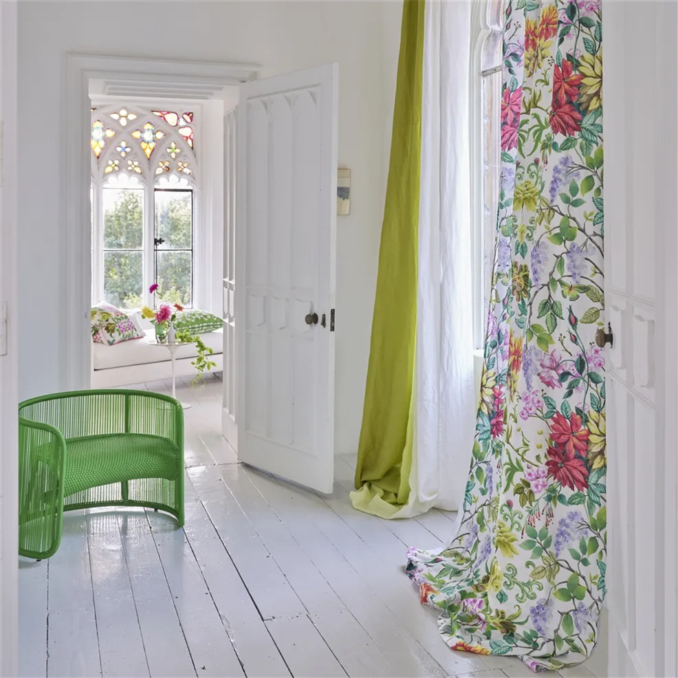 Eleonora von Designers Guild - Elegante malerische Stauden und hängende Frühlingsblumen auf einem gespiegelten Damastdesign. Digital auf ein gewalktes Leinen gedruckt für wunderschöne Vorhänge, Kissen und Jalousien. Öko-Tex zertifiziert.