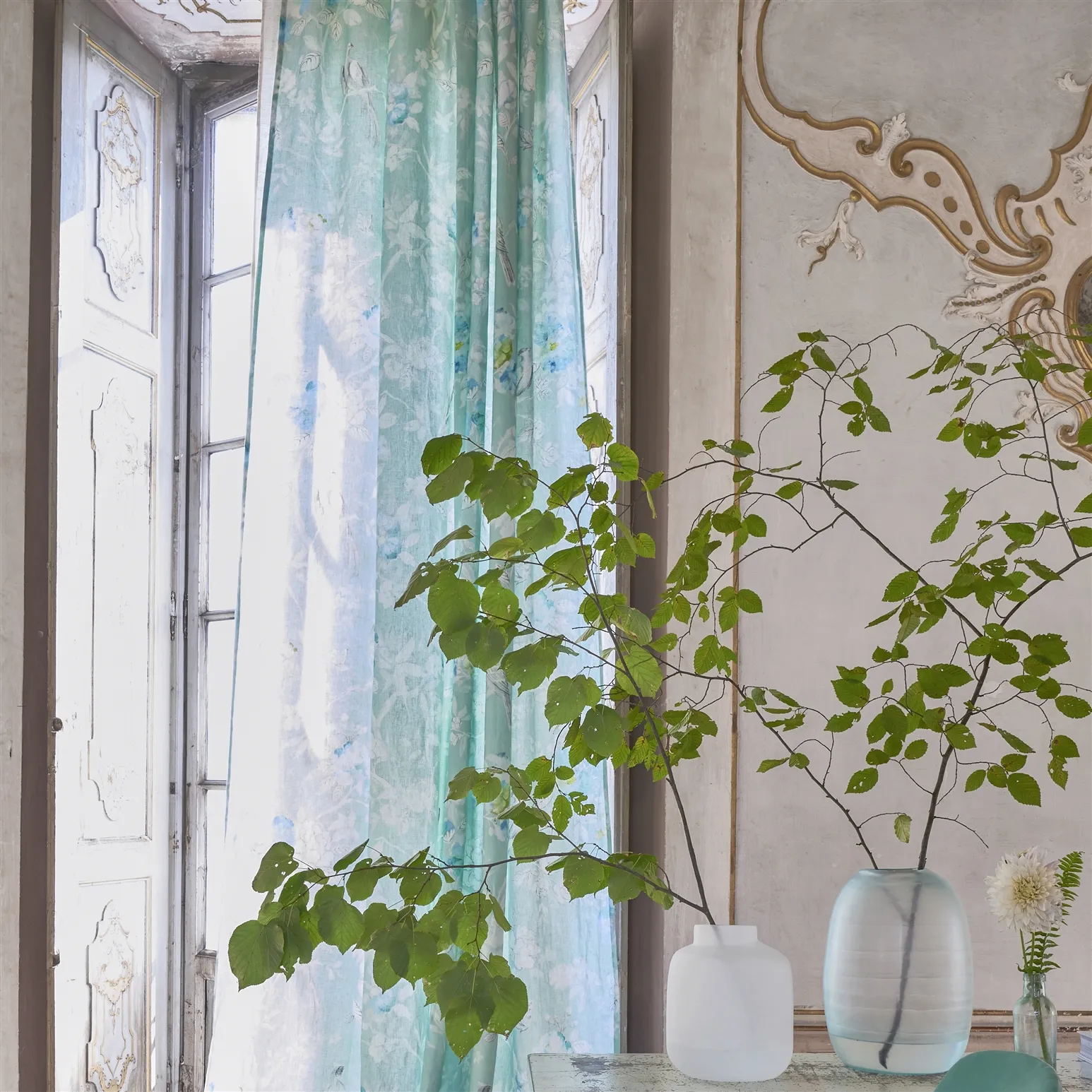 Pontoise von Desingers Guild ist ein klassischer Chinoiserie-Druck mit einem besonderen Unterschied. Bleistift schraffierte Vögel und Blüten stehen wunderschön im Kontrast zu dem Aquarellhintergrund und auf ein 100% Leinengrund gedruckt. Dieses hübsche Design ist in zwei Farben erhältlich und ist der ideale Stoff für Vorhänge, Jalousien, Kissen und Bettdecken. Erhältlich in drei ruhigen Farbtönen.