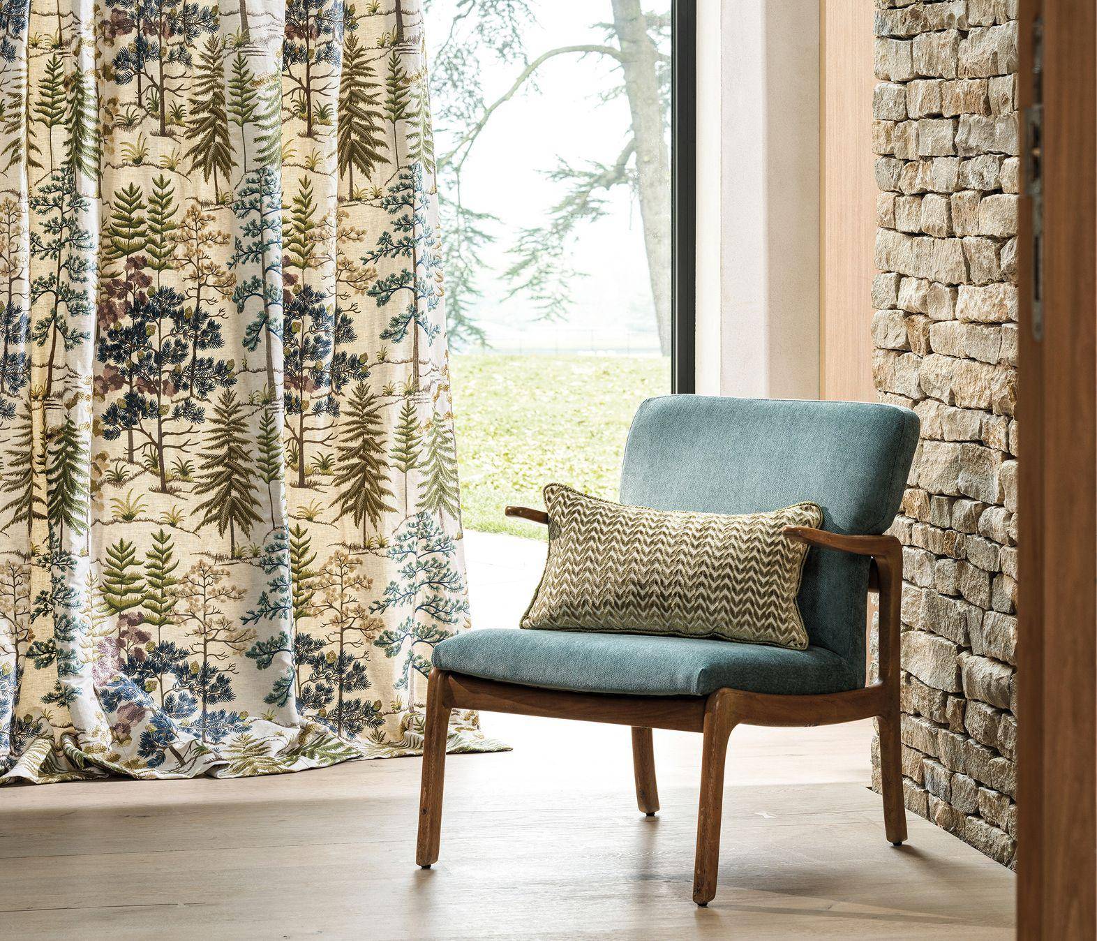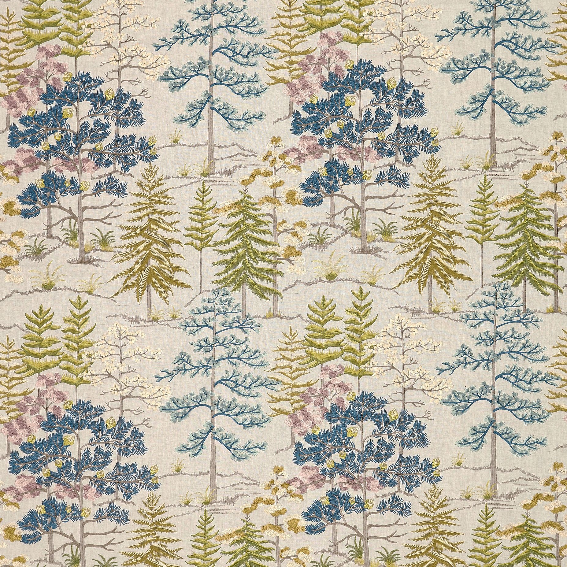 Vana von Osborne & Little ist ein extravaganter Dekostoff mit feinem Leinen kunstvoll bestickt. Die Ruhe eines europäischen Waldes mit Tannenbäumen und immergrünen Pflanzen, die auf Leinen gestickt sind. Das Muser erinnert an einen Wald mit seinen vielen Farbfacetten die elegant in aufwendiger Stickerrei ausgeführt werden.
