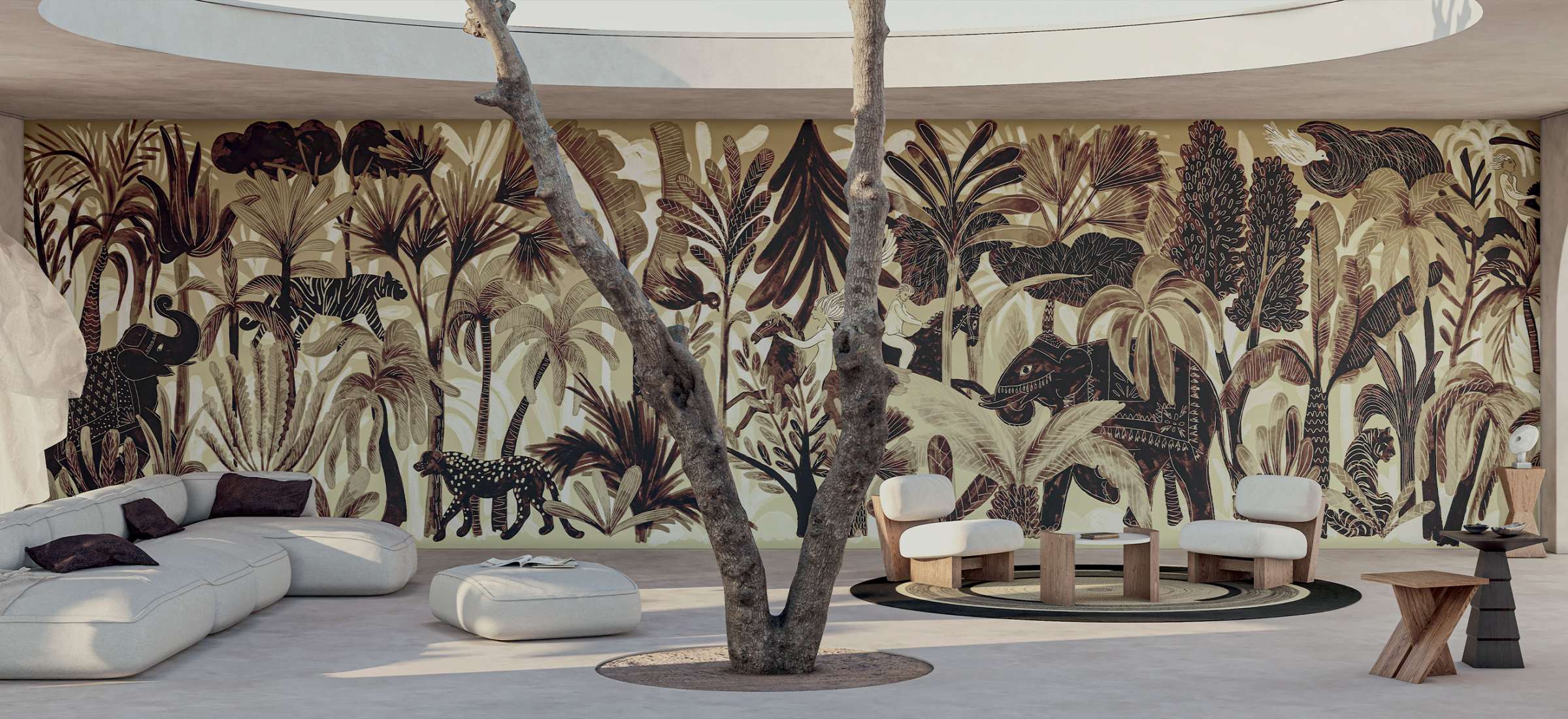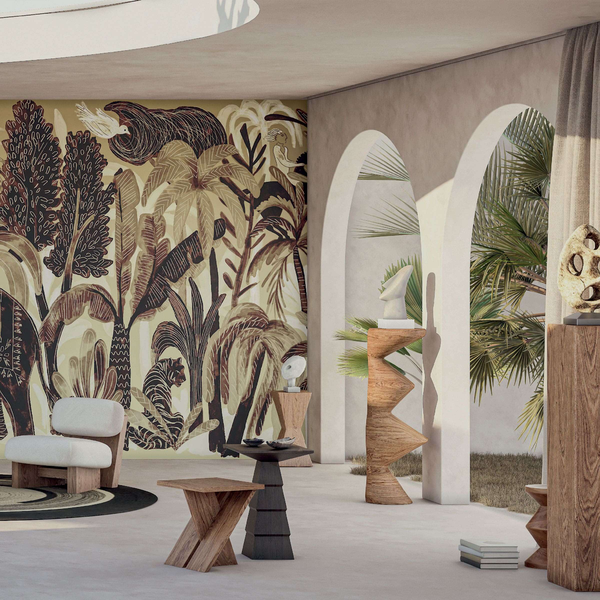 Bel ami entfaltet eine bildhafte Szenerie, in der die Natur – frei von menschlichem Eingriff – in ihrer reinen Schönheit Einzug hält. In der Ruhe der Nachsaison fängt das Wandbild die Feinheit eines Moments zwischen Himmel, Meer und üppiger Vegetation ein. Die grafische Linie ist leicht und elegant gestaltet, sie breitet sich wie eine feine Erzählung entlang der Wandfläche aus – endlos nach links wie nach rechts, im Panoramaformat
