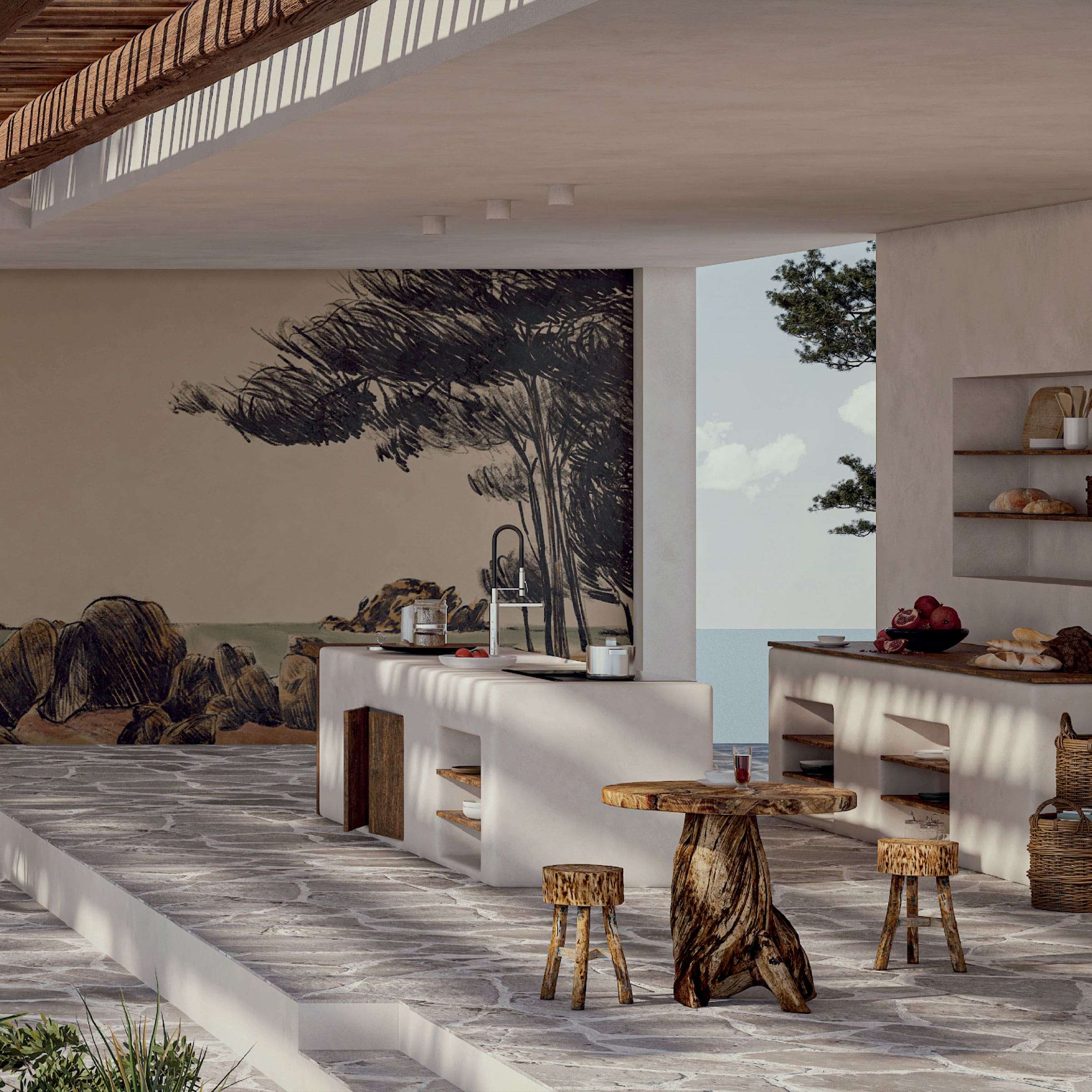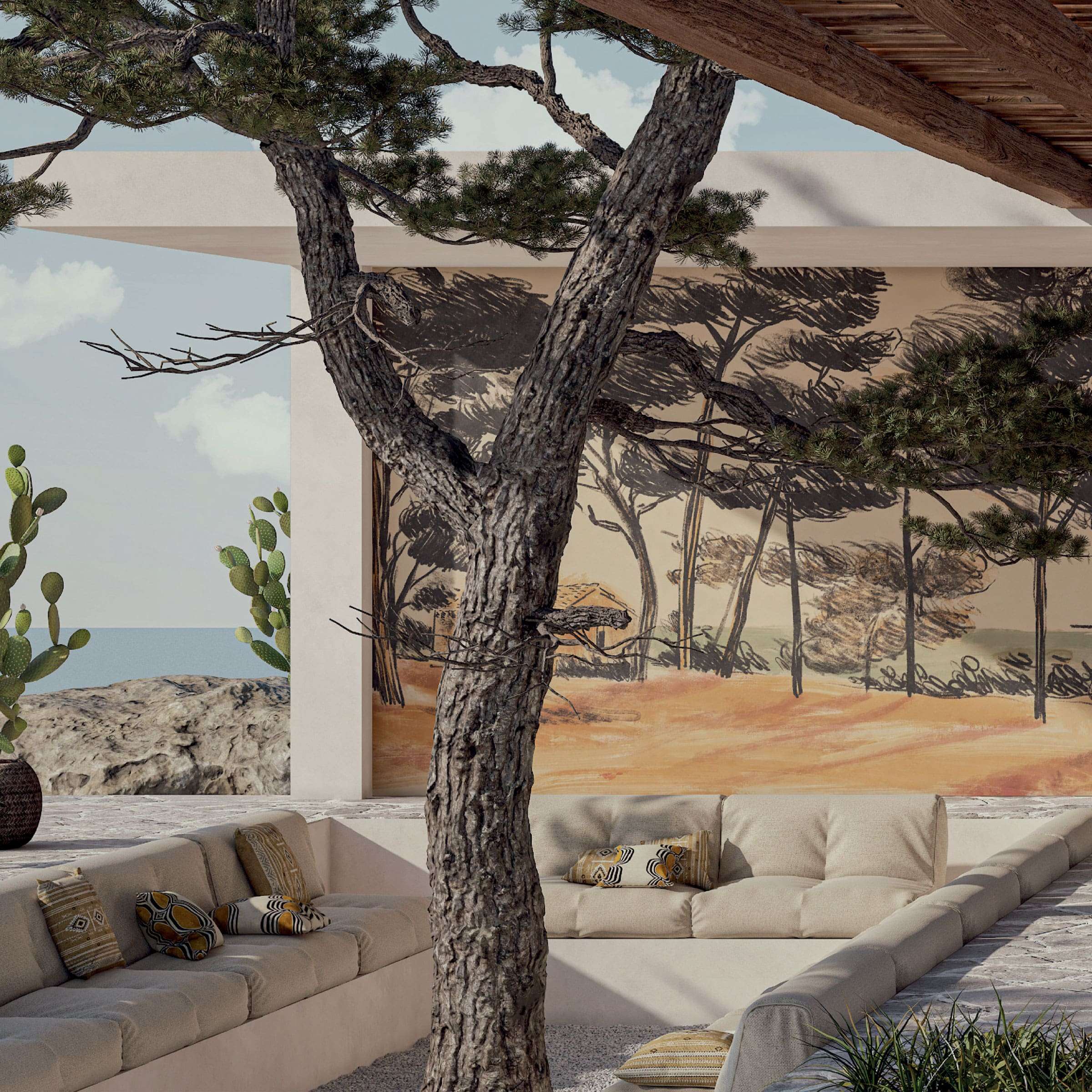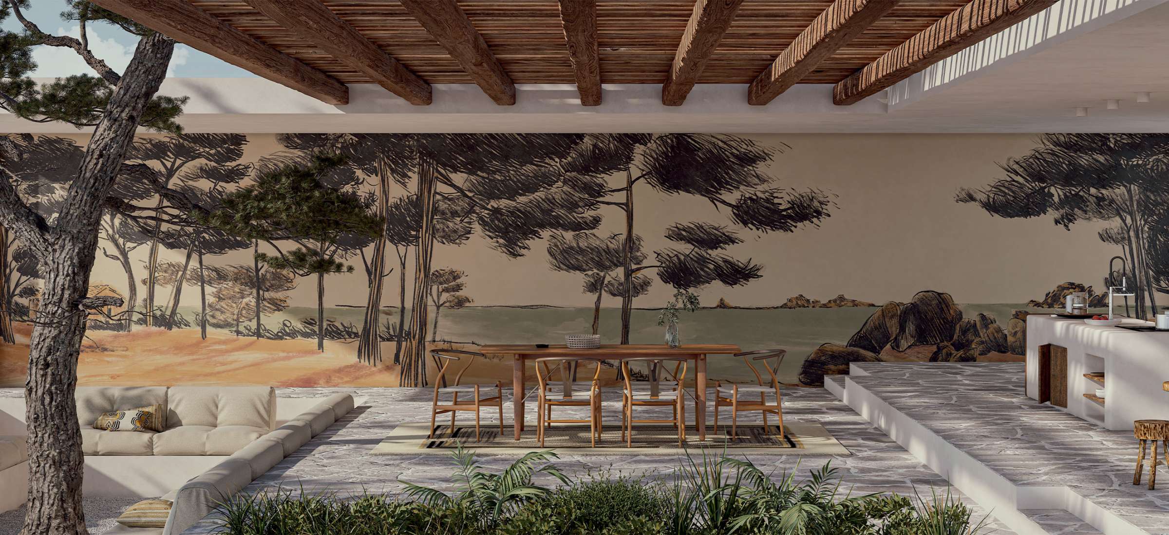 Hors saison entführt in eine Landschaft weitab vom Trubel der Saison – die Welt in ihrer ungestörten Schönheit. Die gezeichneten Konturen erzählen sanft vom Übergang, suggerieren die Weite von Wald, Meer und Licht, die über die gesamte Wand fließen. Das Design wirkt wie eine endlose Erzählung: links und rechts verlässt die Landschaft nie den Blick, sondern wird zum visuellen Gedicht