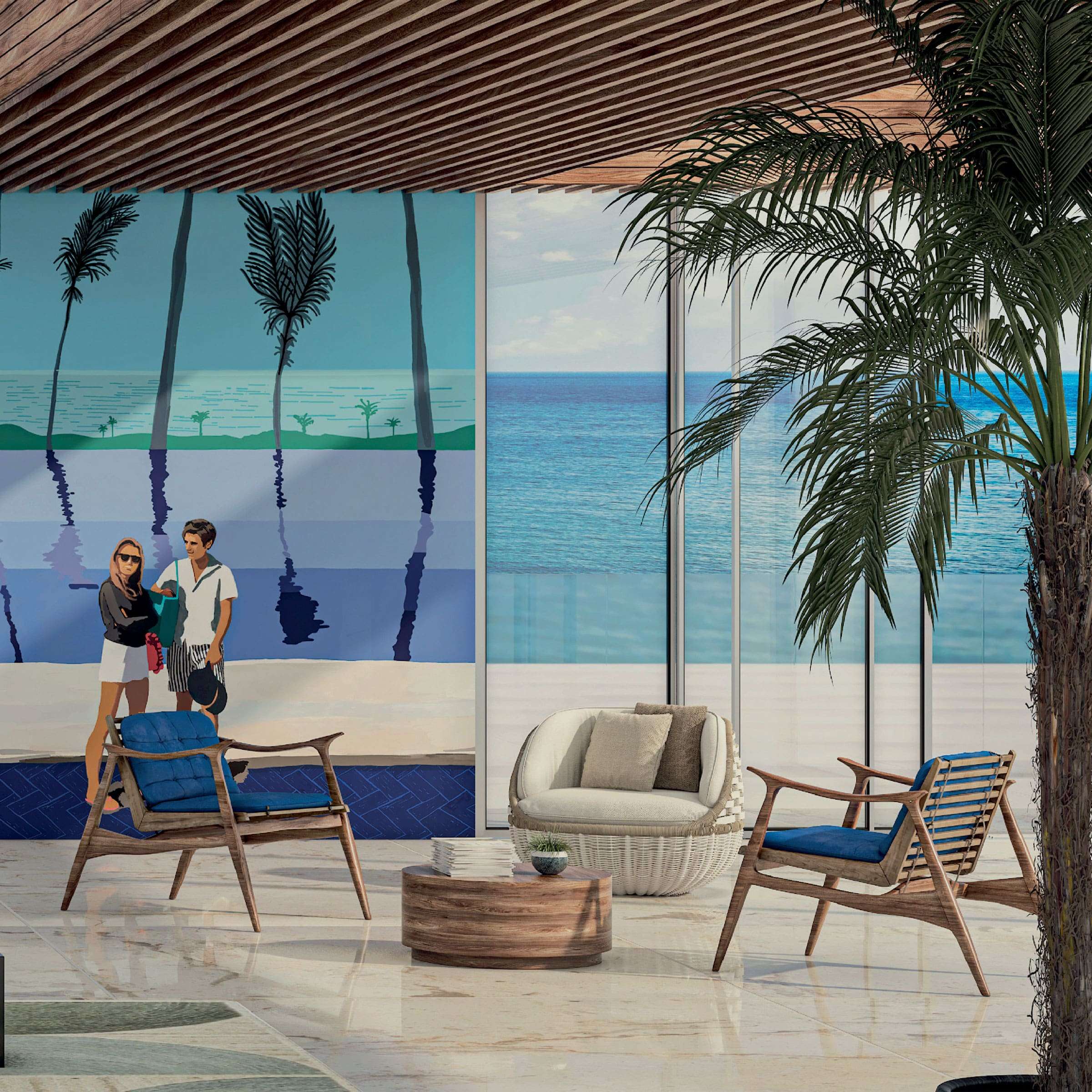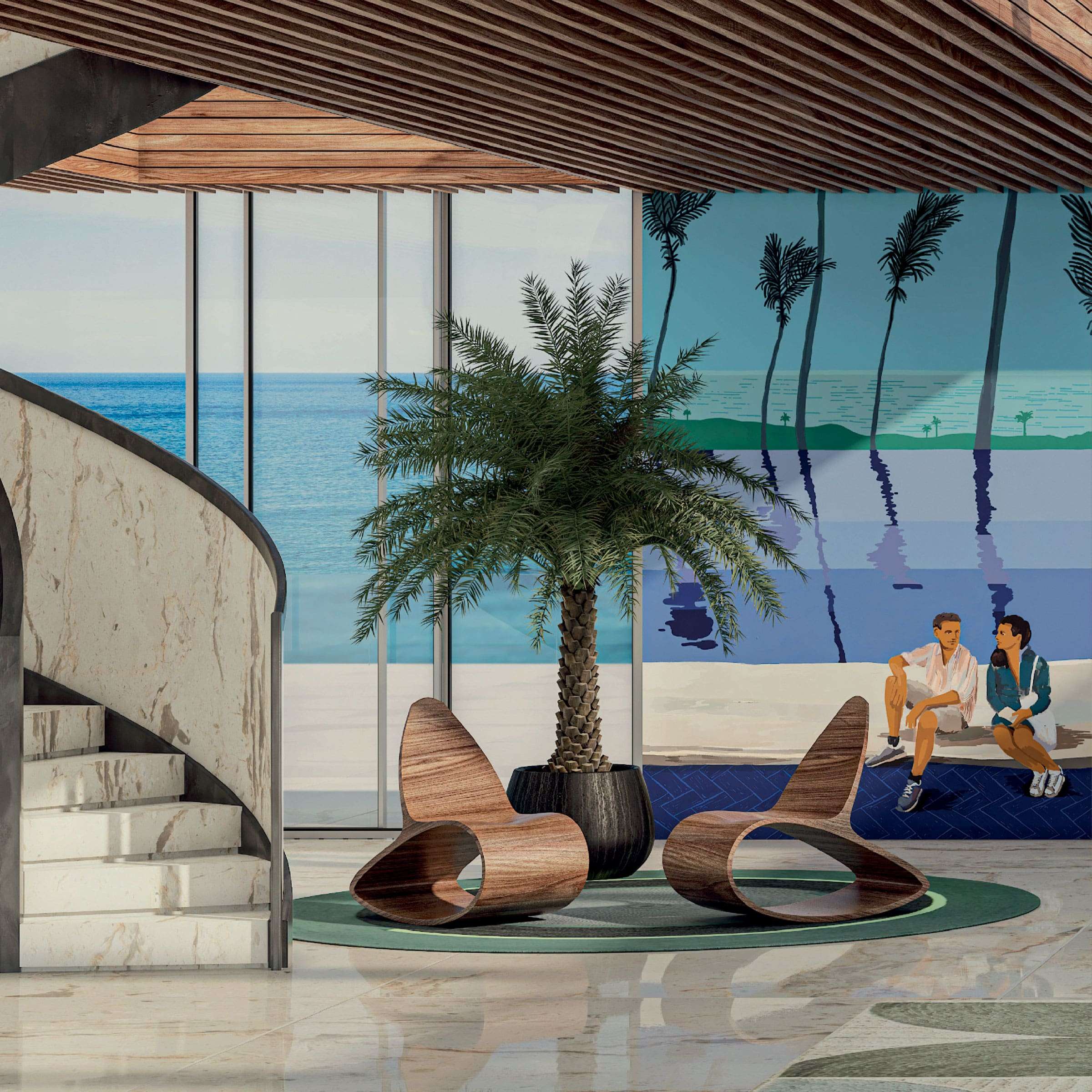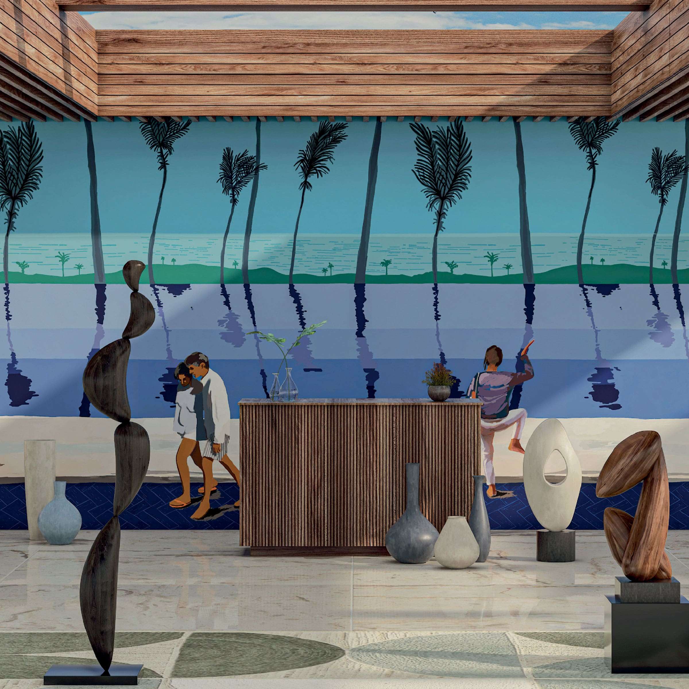 Ideal für moderne Wohnräume, Lounges oder Empfangsbereiche, die eine entspannte und stilvolle Atmosphäre ausstrahlen sollen. Die Tapete schafft eine visuelle Weite und zieht den Betrachter in ihren Bann