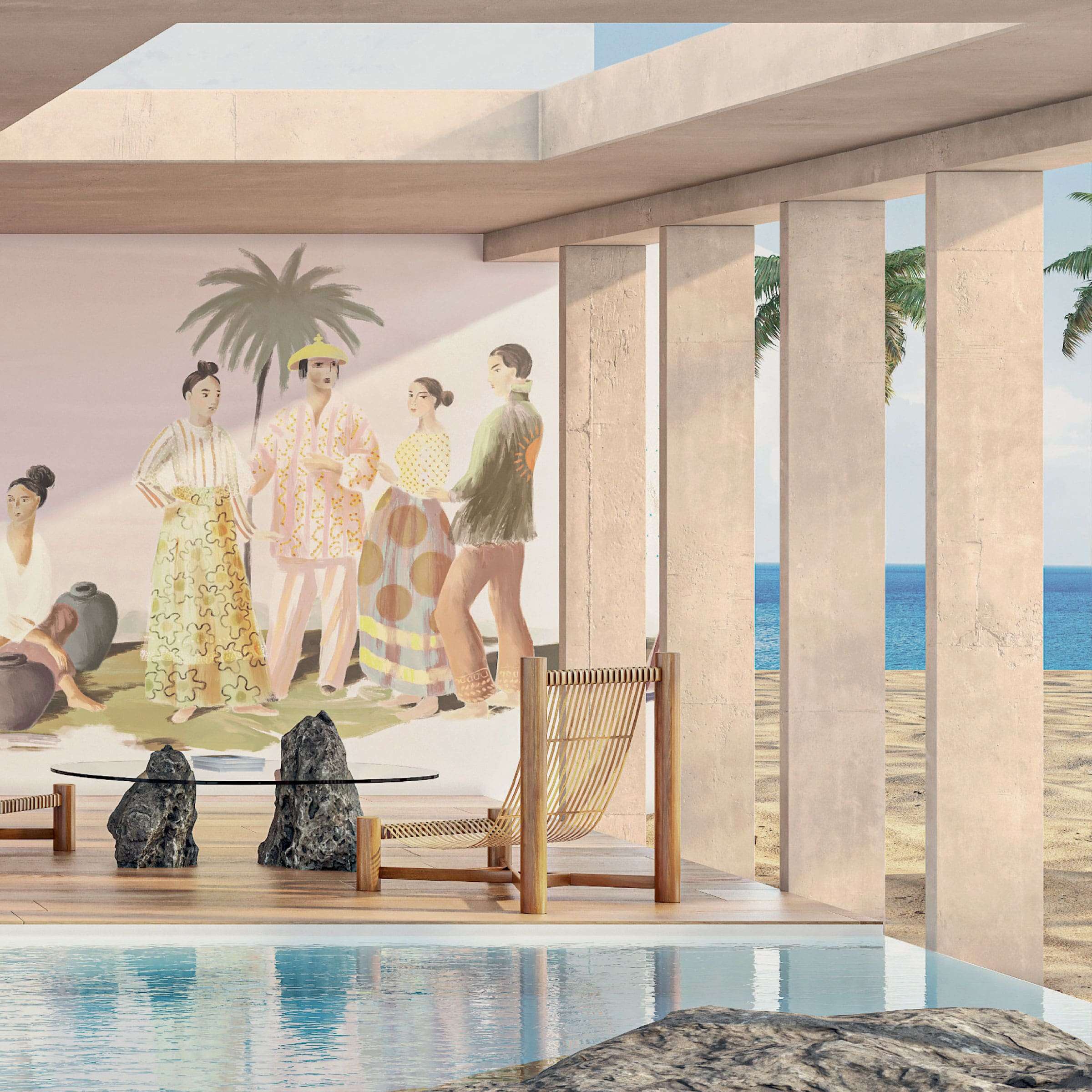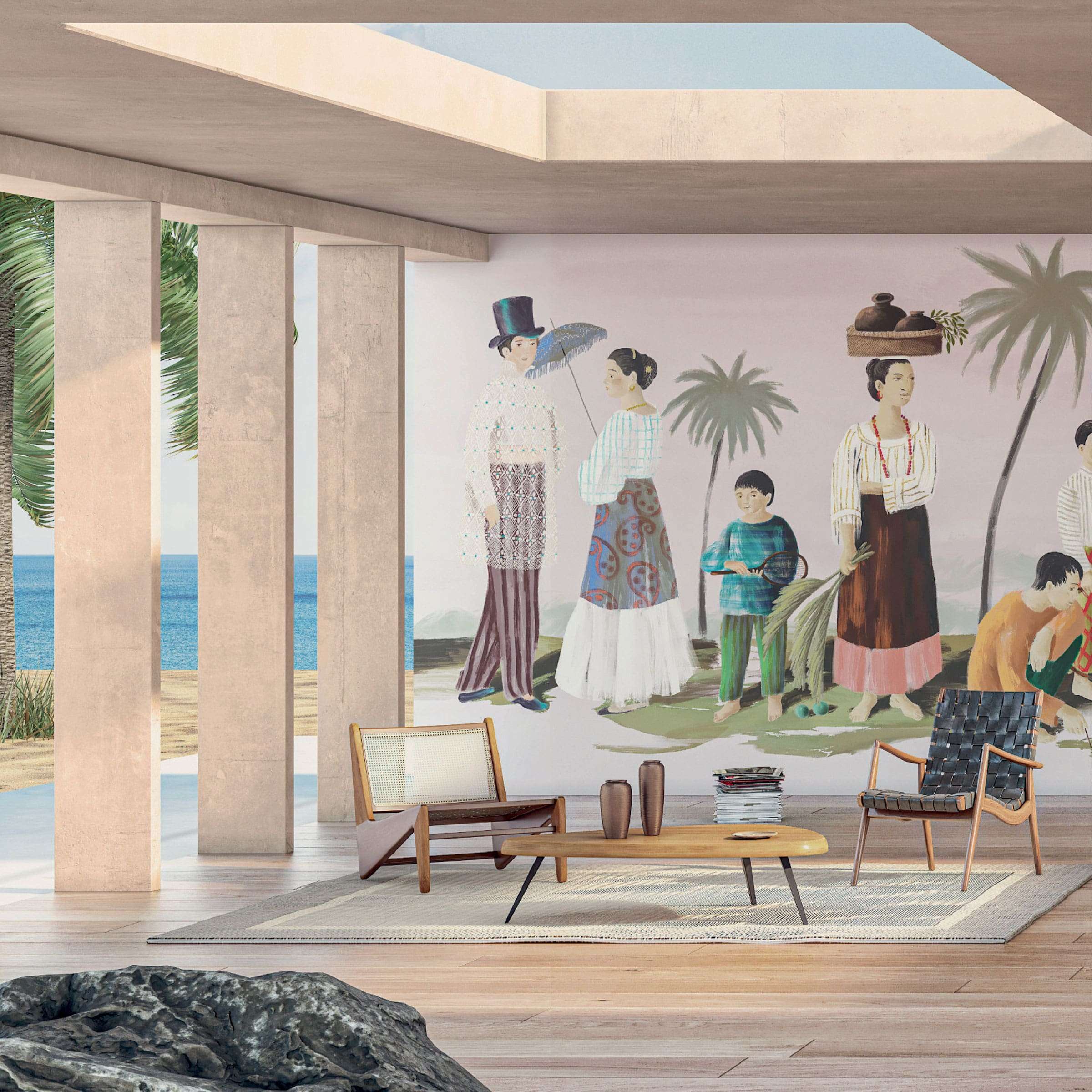 Ideal für moderne Wohnräume, Lounges oder Empfangsbereiche, die eine entspannte und stilvolle Atmosphäre ausstrahlen sollen. Die Tapete schafft eine visuelle Weite und zieht den Betrachter in ihren Bann
