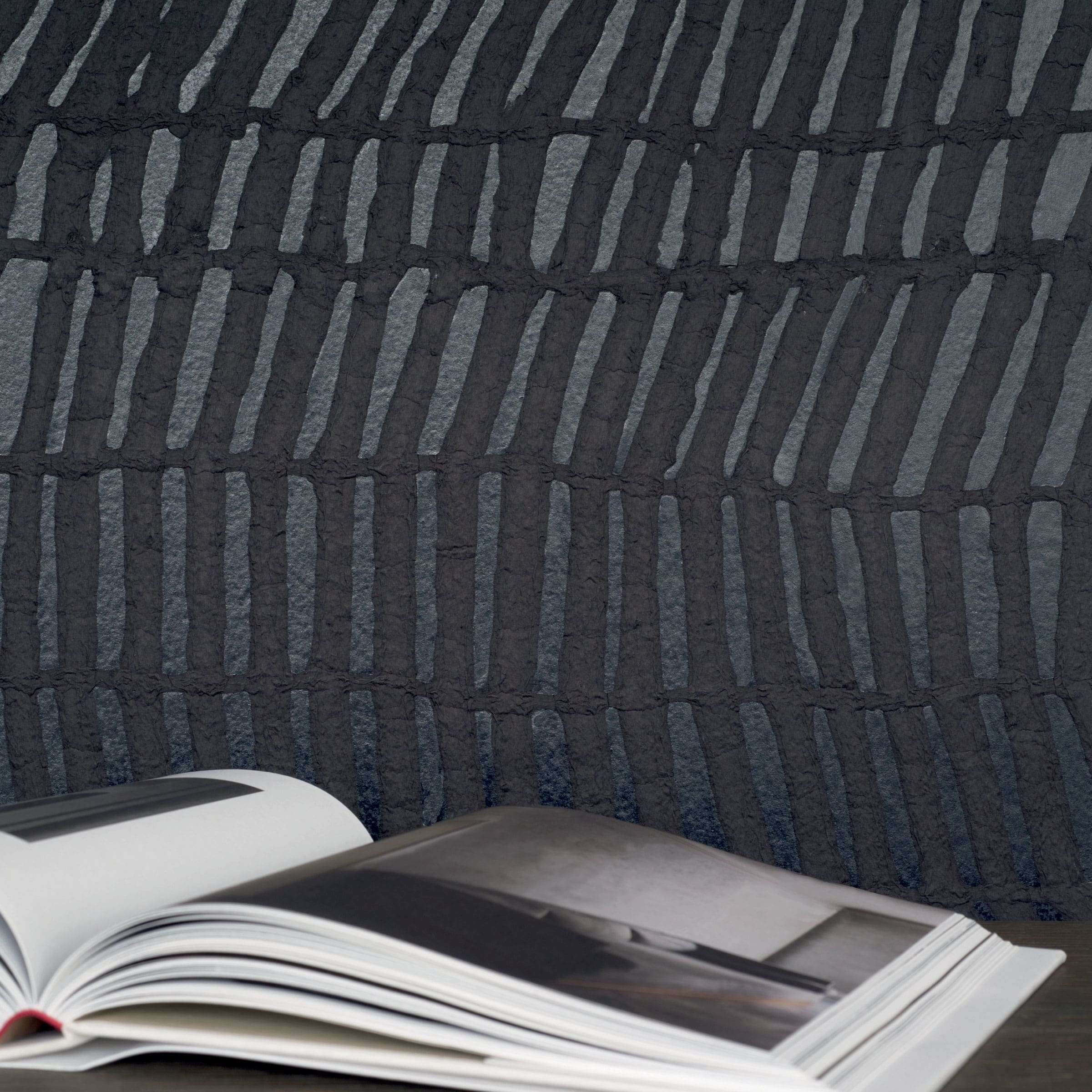 Die Tapete Amakusa gehört zur Paper Sculpture-Linie von ÉLITIS und besteht aus handmodelliertem Papier Abaca-Faser, Maulbeerpapier auf Vliesträger. Die Oberfläche spielt kunstvoll mit glatten, reliefartigen und metallisch schimmernden Flächen, wodurch ein zauberhafter Materialkontrast entsteht – mal matt, mal glänzend – und jeden Streifen zu einem Unikat macht