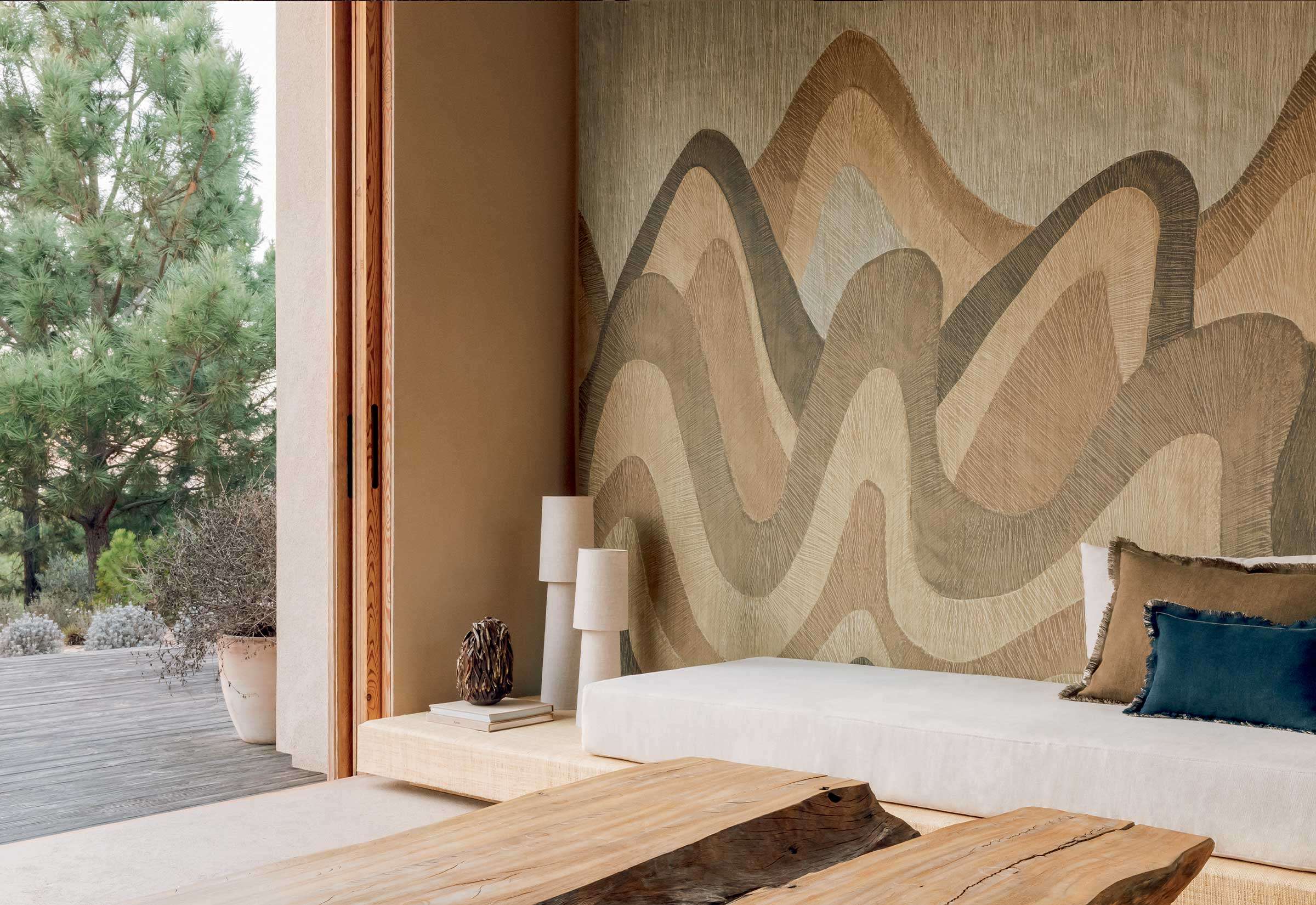 Pignada entfaltet eine szenische Komposition, die an die verschlungenen Konturen einer bewaldeten Landschaft erinnert. Reliefarte Gravuren – Maserungen, Risse, Adern – scheinen im Panorama wie feine Holzspäne zu tanzen, als wäre die Tapete frisch geschnitzt. Die Oberfläche wirkt lebendig, mit plastischer Tiefe, die Räume in ein strukturelles Erlebnis verwandelt. Inspiriert vom Tanz eines Schnitzmeisters, der die Adern des Holzes freilegt und so eine Landschaft aus Relief schafft, fängt Pignada diese sinnliche Dynamik ein und verleiht jeder Wand eine fast meditative Präsenz