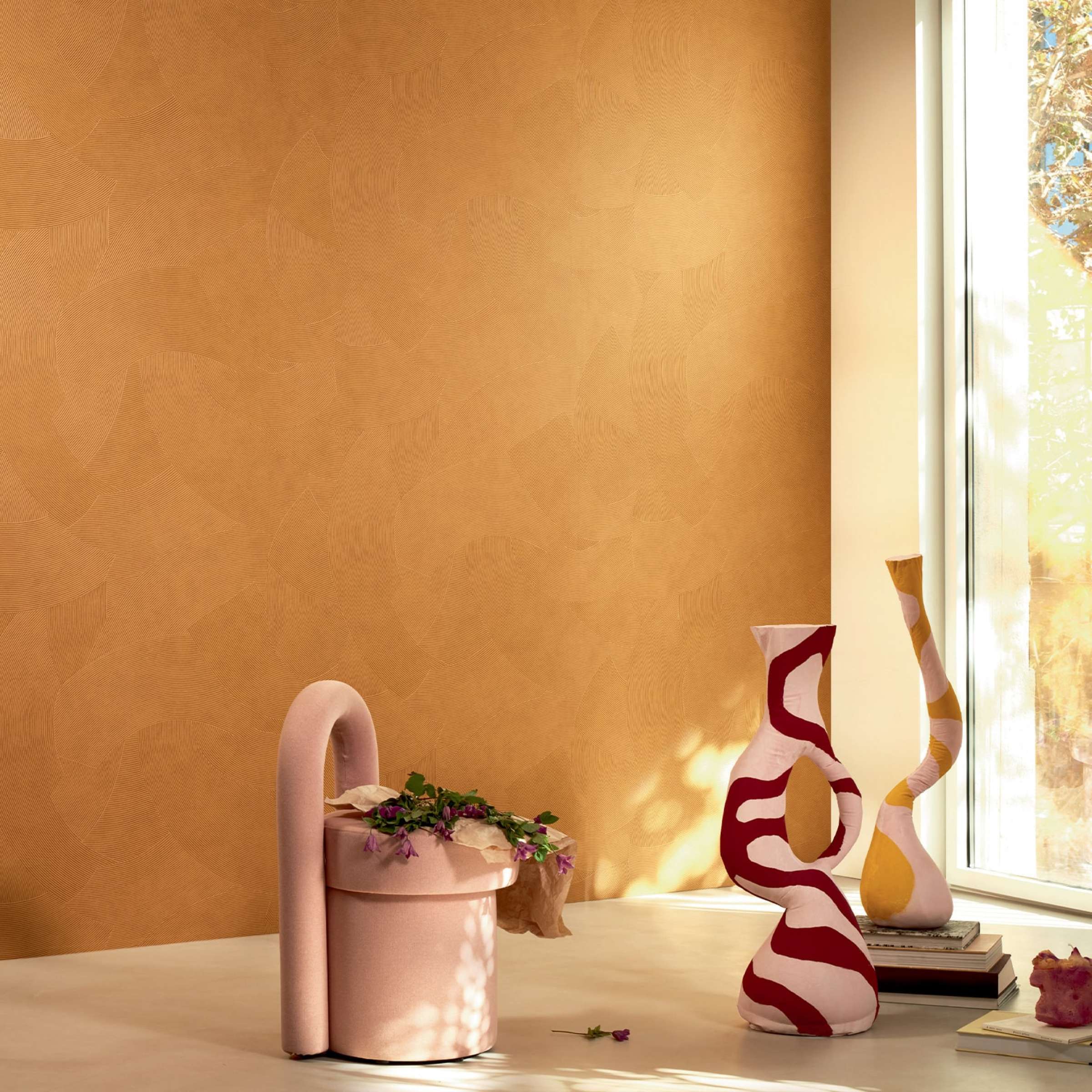 Circolo – Un éclat de lumière vereint Élitis in Kooperation mit Callidus Guild tradierte Handwerkskunst mit moderner Interpretation: zahlreiche feine Rillen bilden kreisförmige Bewegungen, die wie vom Meisterputzer mit feinem Werkzeug gezogen wirken. Die narbenartige Textur fängt Licht und Schatten ein – wie ein leiser Tanz aus Struktur und Haptik