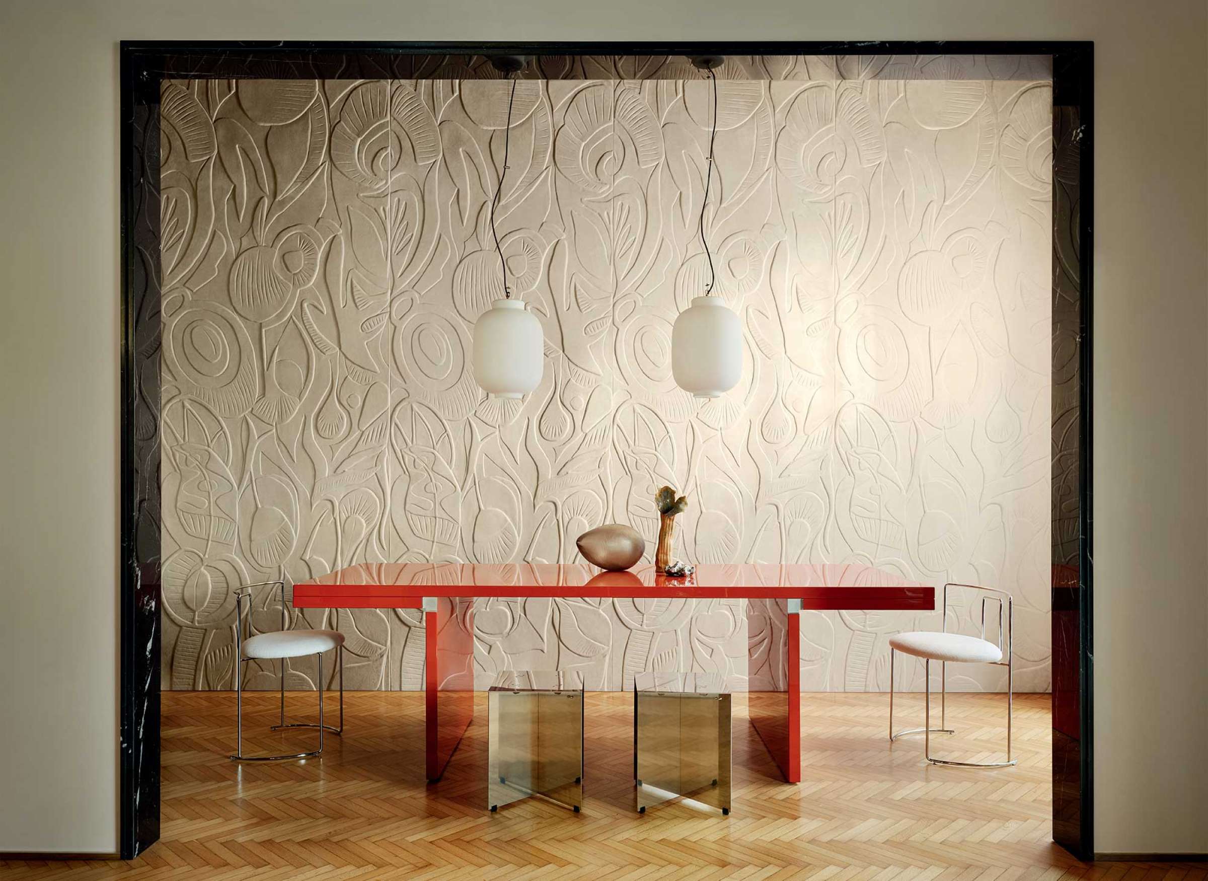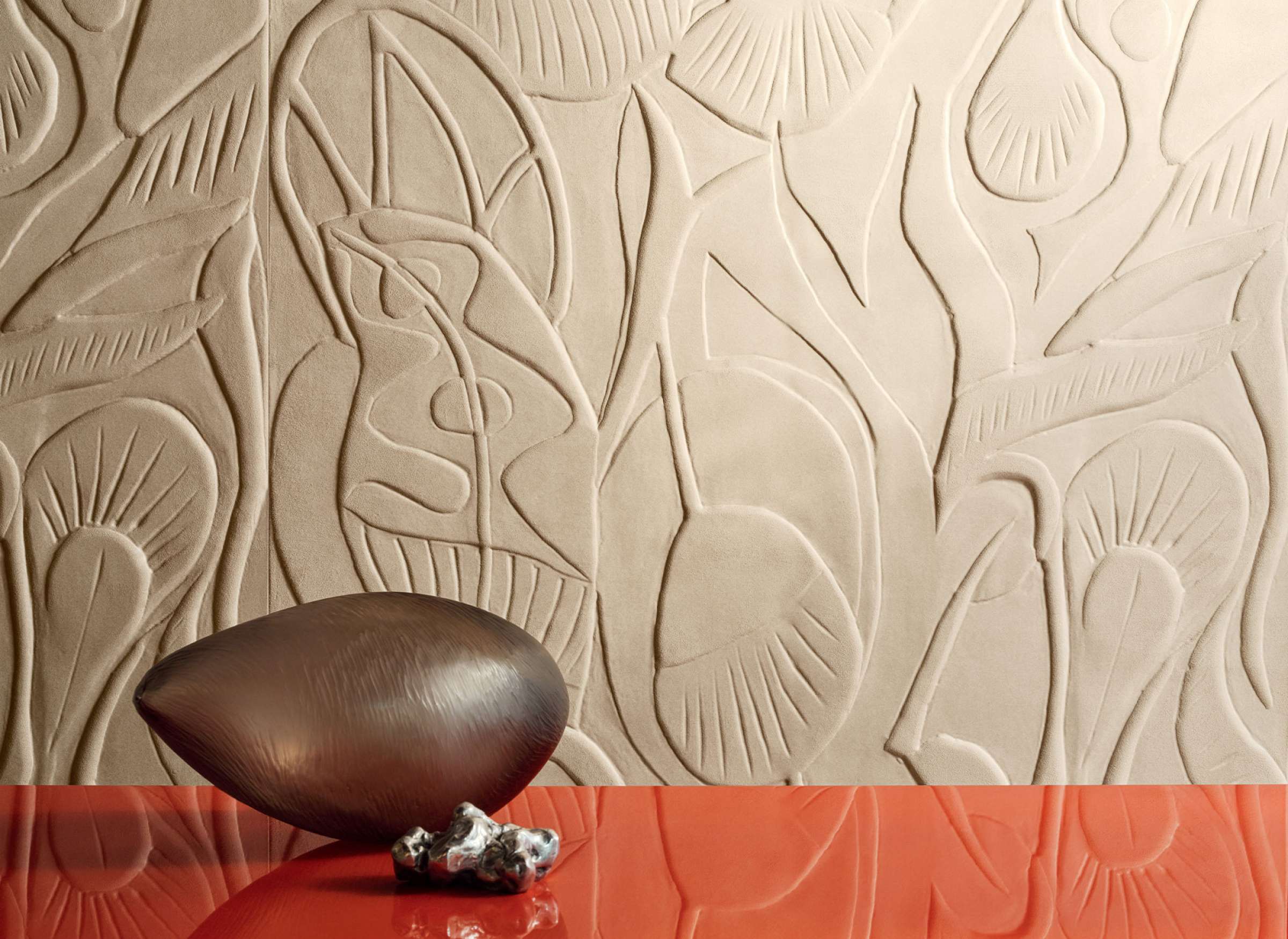 Colosse fruitier verwandelt jeden Raum in eine poetisch-skulpturale Landschaft aus sanften Fruchtformen und Blattmustern. In Wohnbereichen, Empfangslounges oder Boutique-Hotels erzielt sie eine ruhige, aber kraftvolle Wirkung. Besonders wirkungsvoll mit reduzierten Farbtönen, Naturholz, Metalldetails oder edlen Textilien kombiniert