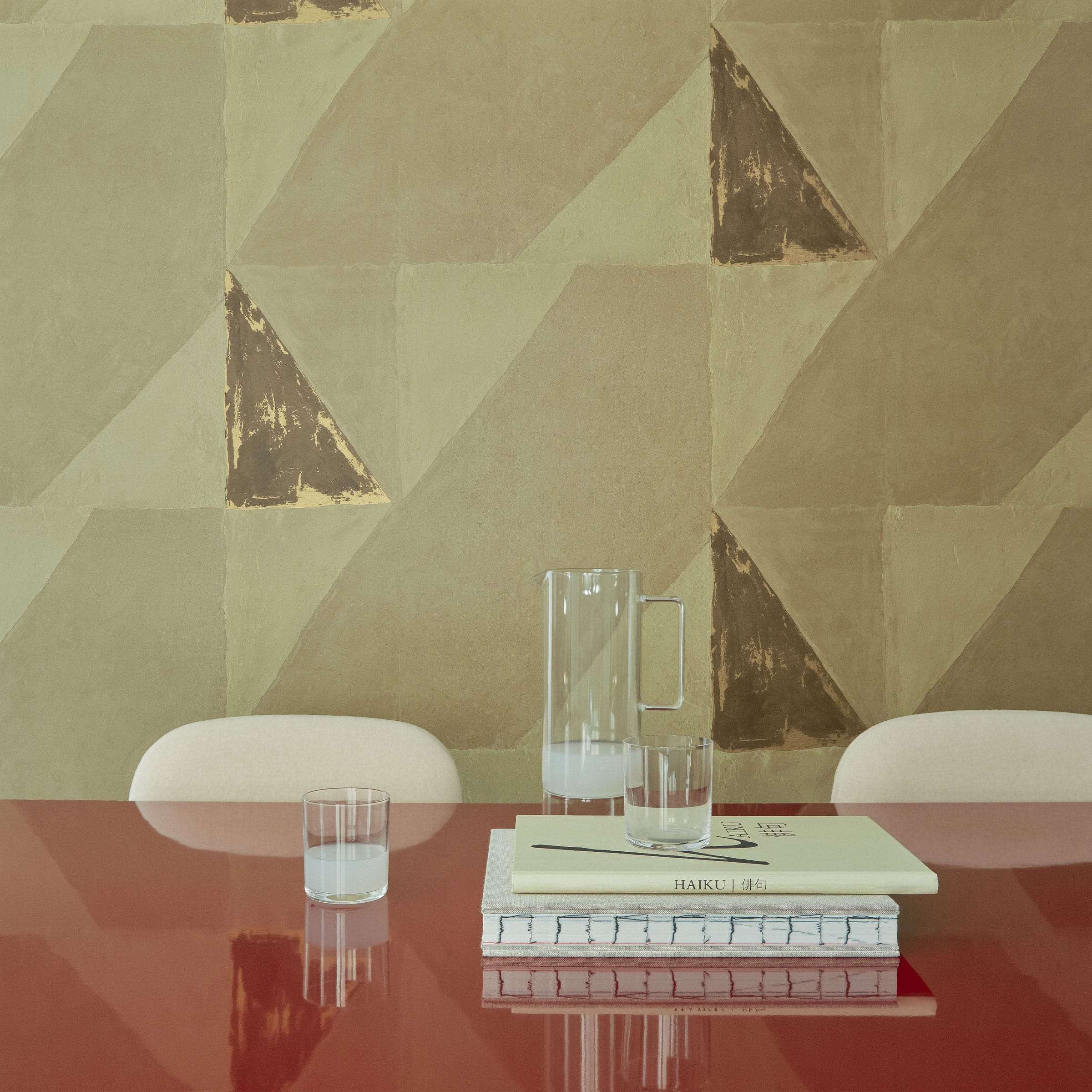 Composition präsentiert ein grafisches, geometrisches Muster, das an handgefertigte Papierkunst erinnert. Die Struktur der Tapete vermittelt die Haptik von echtem Papier und erzeugt einen faszinierenden 3D-Effekt. Dieses Design bringt eine künstlerische Tiefe in jeden Raum und fügt sich harmonisch in verschiedene Einrichtungsstile ein