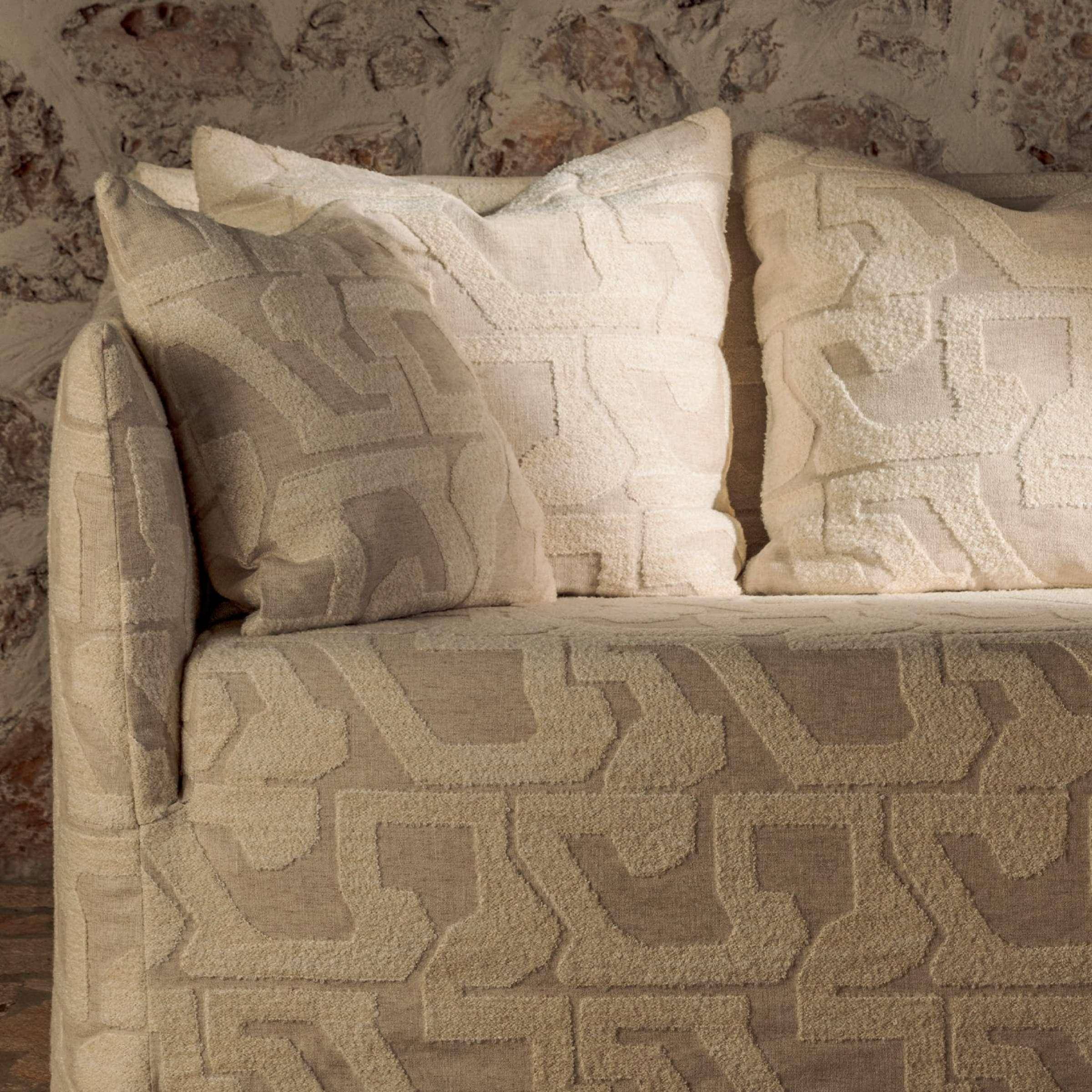 Subtile Ton-in-Ton-Geometrie, moderne Motive, Zartheit des gestickten Bouclette-Garns, Leinengrund, strukturierte Formen, Cross-over zwischen Klassik und Moderne, weicher Griff, für Polster und Vorhänge, Naturtöne