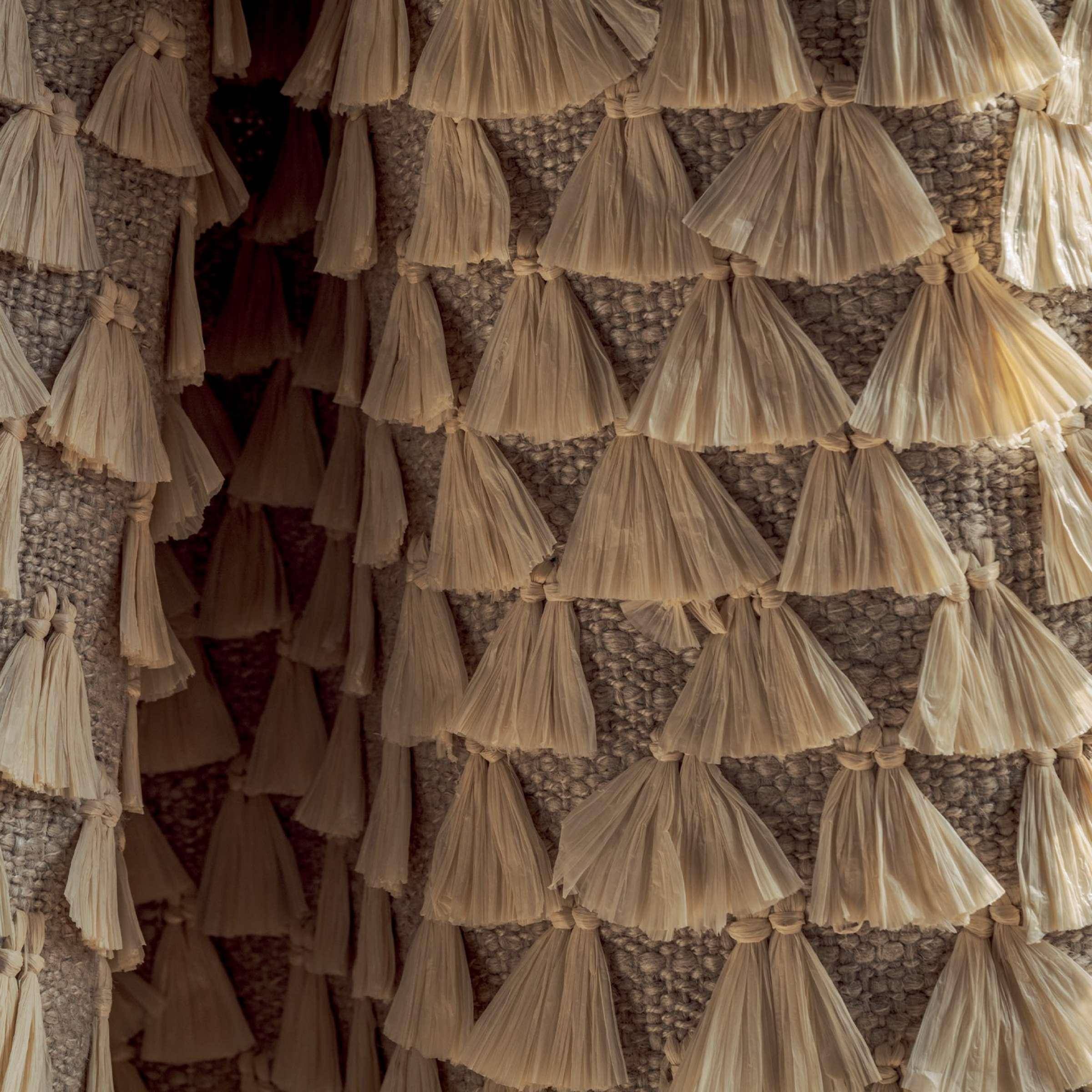 Handgefertigte Stickerei, bestickte Raffia-Pompons, strukturierte Komposition, handwerklicher Geist, dreidimensionaler Aspekt, 70er-Jahre-Stil