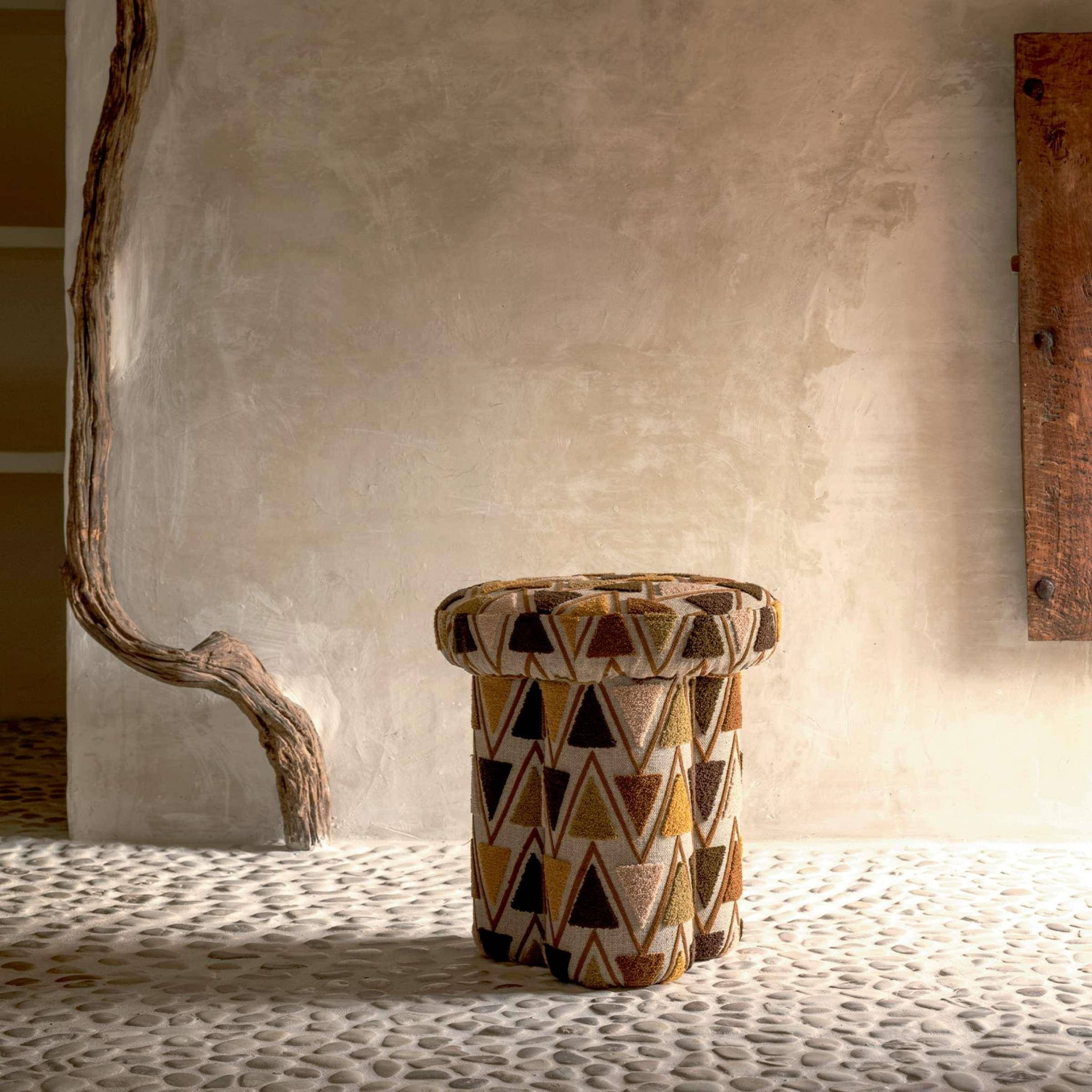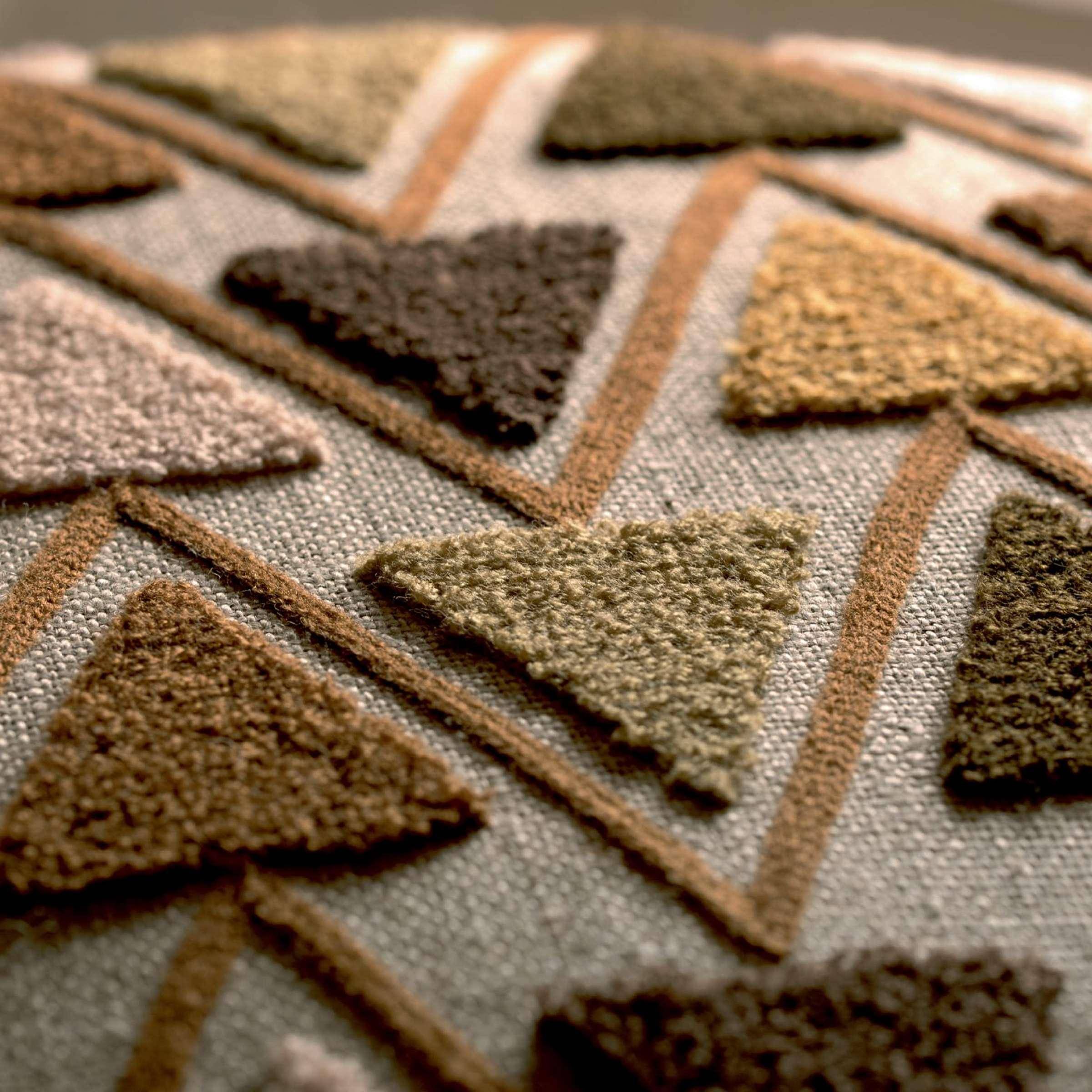 All-Over aus gestickten Dreiecken, Schlingeneffekt in Stickstichen, ethnischer Geist, durch gestickte Linien umrissene Formen, für Polster und Vorhänge, Leinengrund
