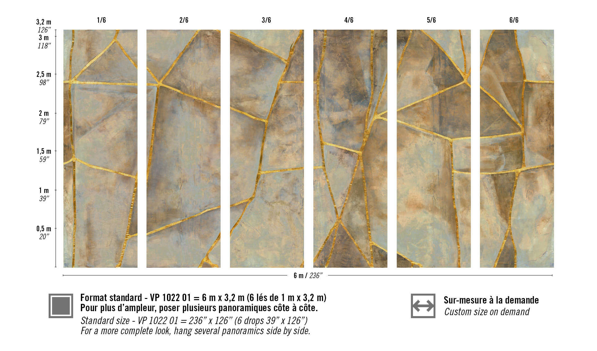 Die Panoramatapete Kintsugi éclat von Élitis interpretiert die japanische Kunst des Kintsugi neu. Sie besteht aus geprägtem Vinyl mit goldfarbenen Rissen und misst standardmäßig 6 m x 3,2 m. Diese Tapete verbindet Gips- und Metalleffekte zu einem einzigartigen, luxuriösen Design.