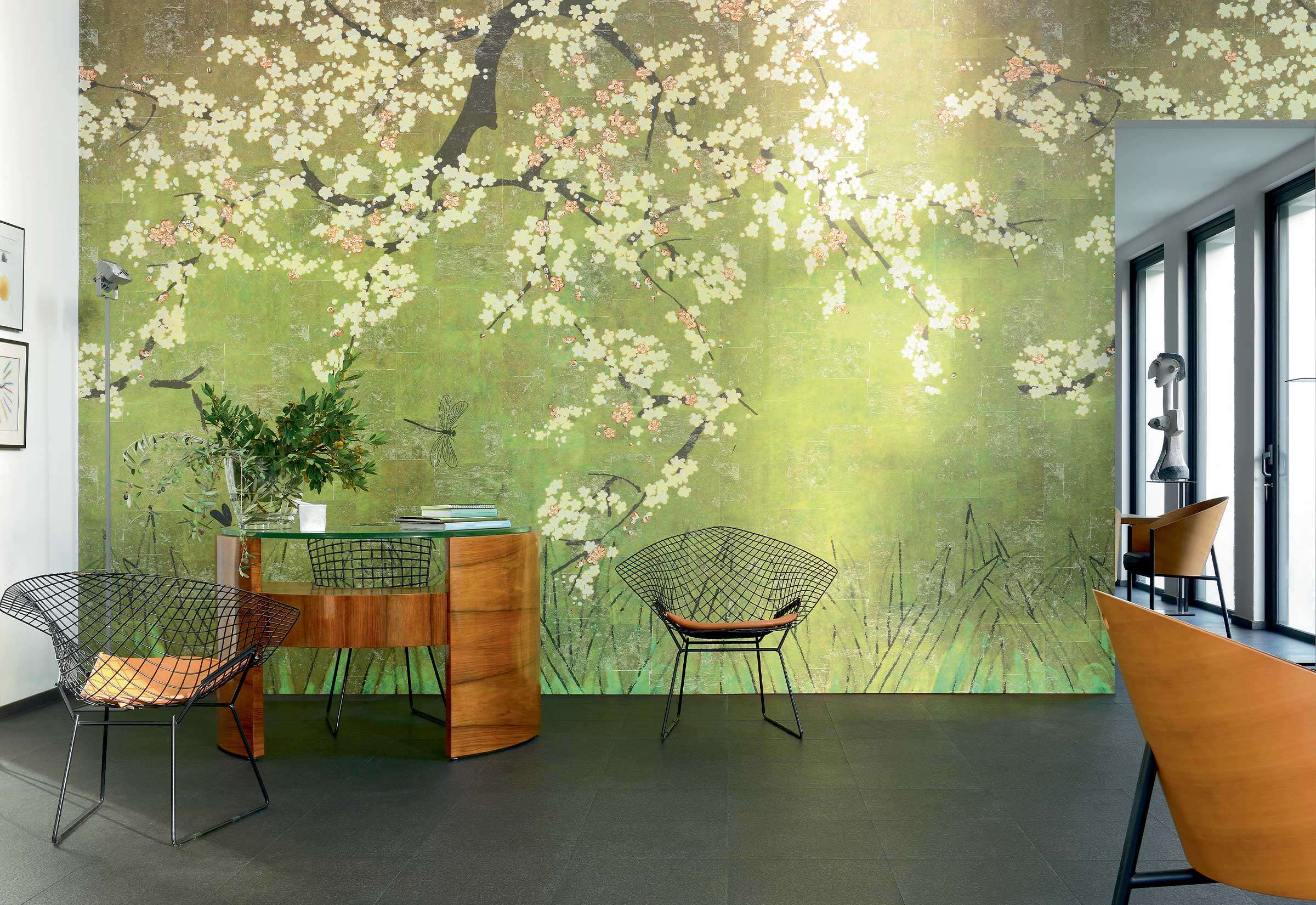 Les Cerisiers Sauvages entfaltet ein zartes Geflecht floraler Ranken, das sich über die Wand zieht. Fein gezeichnete Blütenzweige, die organisch in Erscheinung treten, verleihen dem Raum eine sanfte, poetische Atmosphäre. Die fein komponierte Vertikaldynamik erinnert an die filigrane Ornamentik fernöstlicher Kimonos – sowohl dekorativ als auch meditative Anmutung