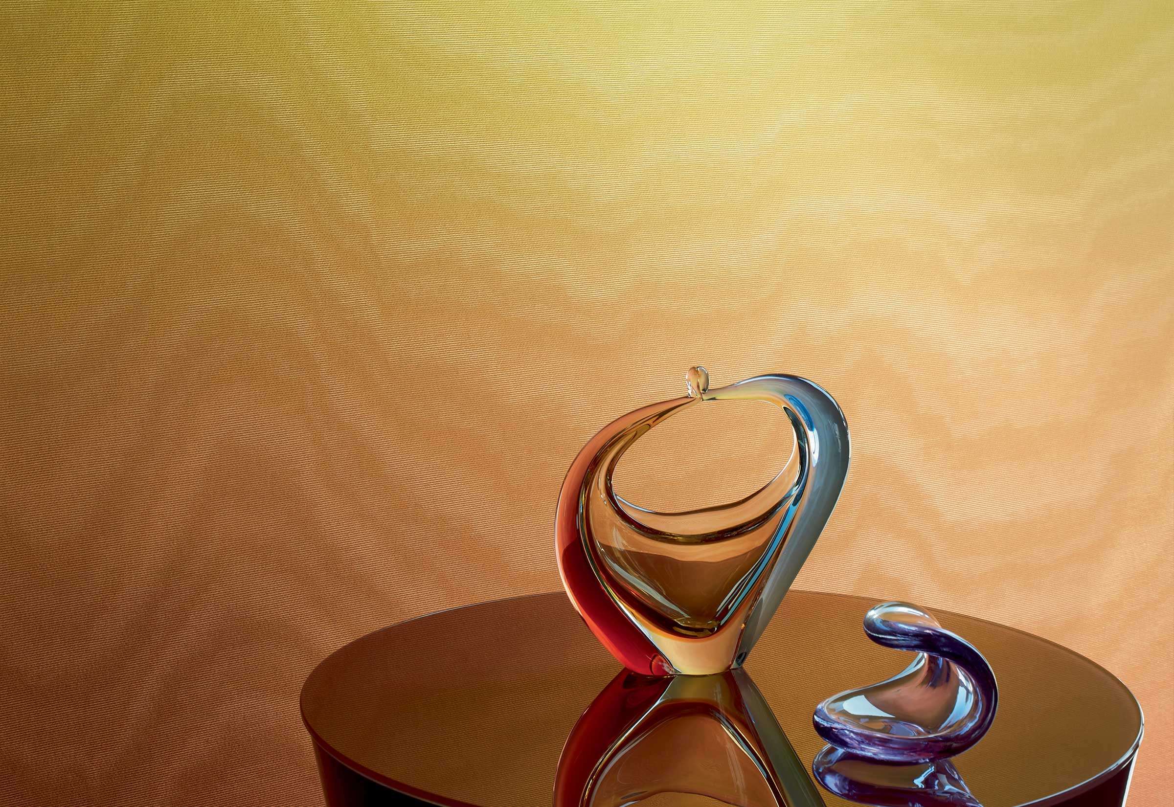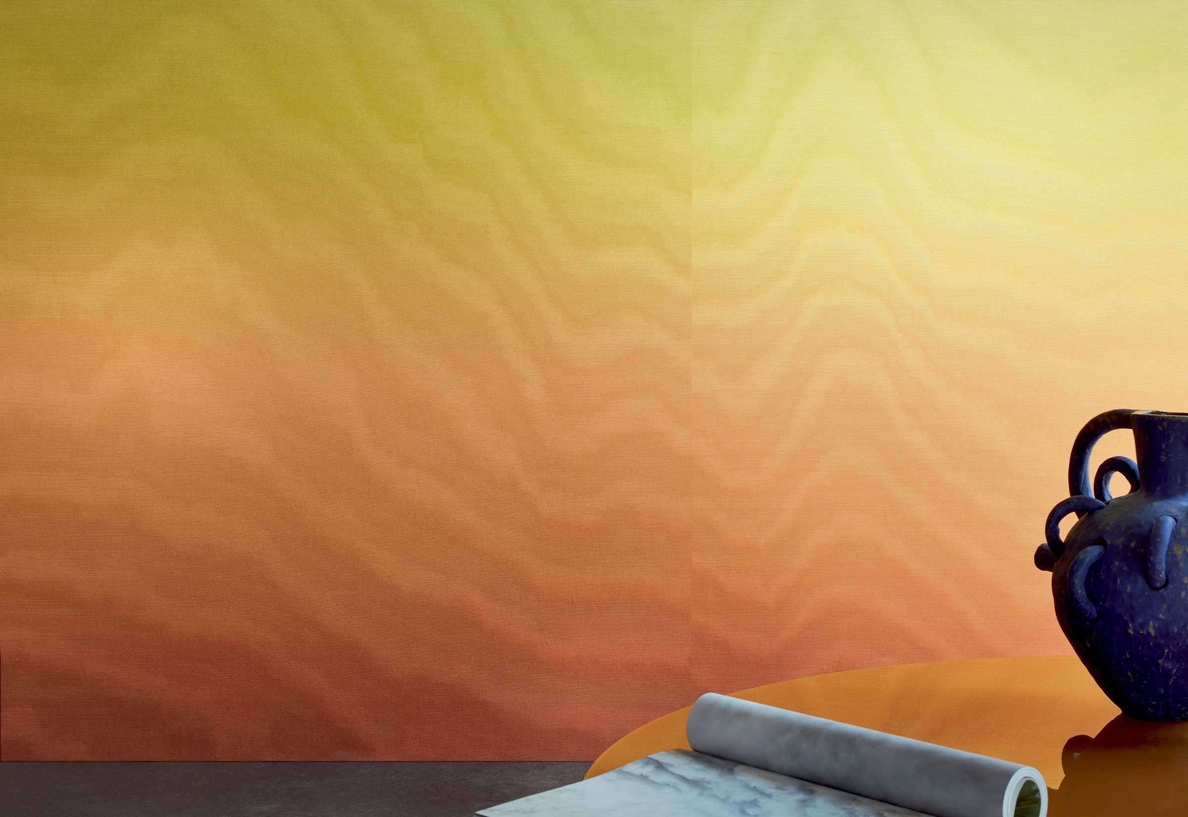 ÉLITIS – Plus pur que le soleil ist ein beeindruckendes Wandpaneel mit lebendig changierendem moiré-Design in einem harmonischen Verlauf von Gelb bis Orange, das an die Wärme eines Sonnenuntergangs erinnert. Diese luxuriöse Kollektion kombiniert weiche, organisch wirkende Wellen mit subtiler Metalliktextur auf einem strukturierten Textilgrund