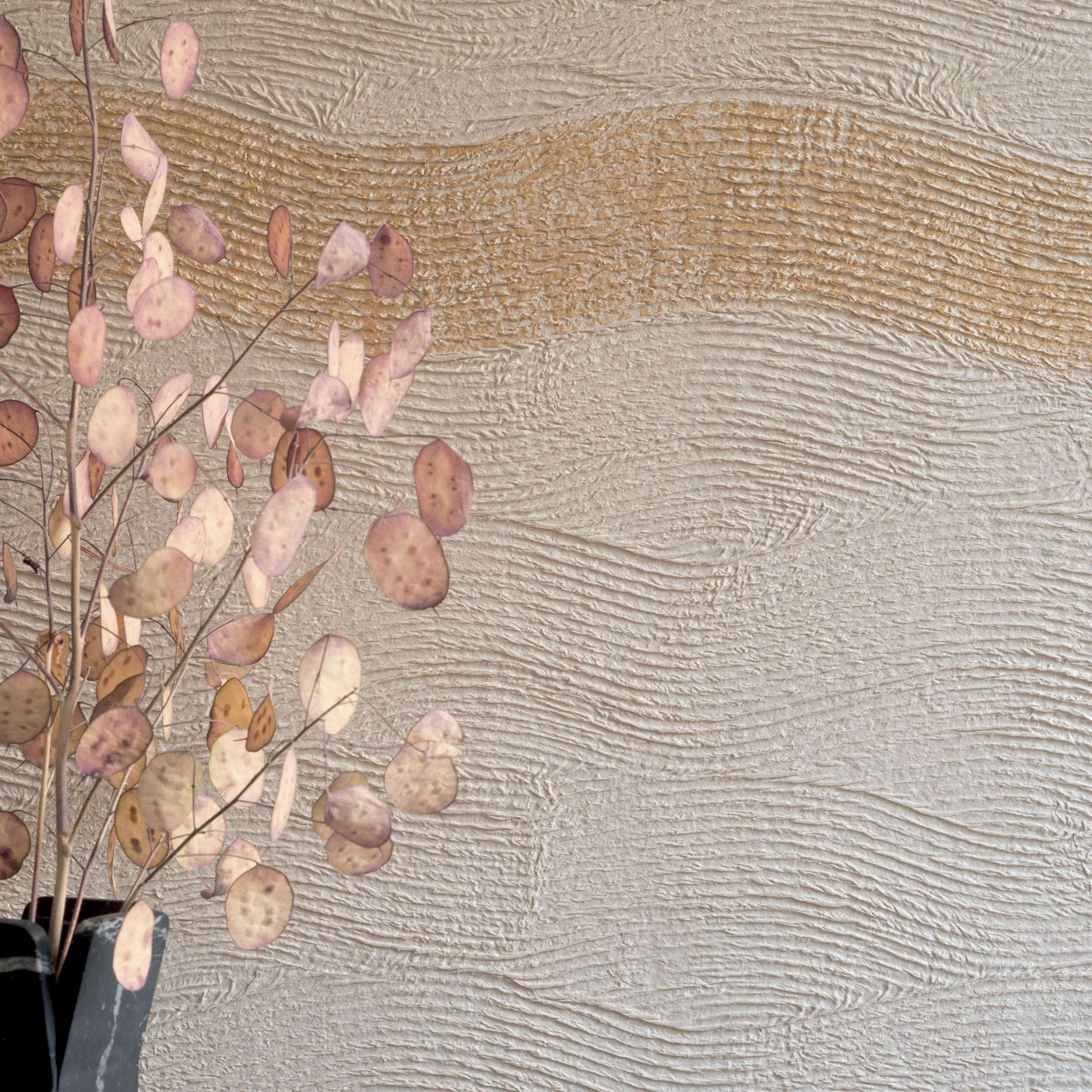 Ideal für elegante Rückzugsbereiche, Design-Bibliotheken oder Galerien, wo eine ruhige, künstlerische Atmosphäre gewünscht ist. Die Tapete wirkt wie ein Kunstwerk, dessen Relief bei unterschiedlichem Lichteinfall neue Nuancen offenbart und sanft Raum für Sinneserfahrung schafft