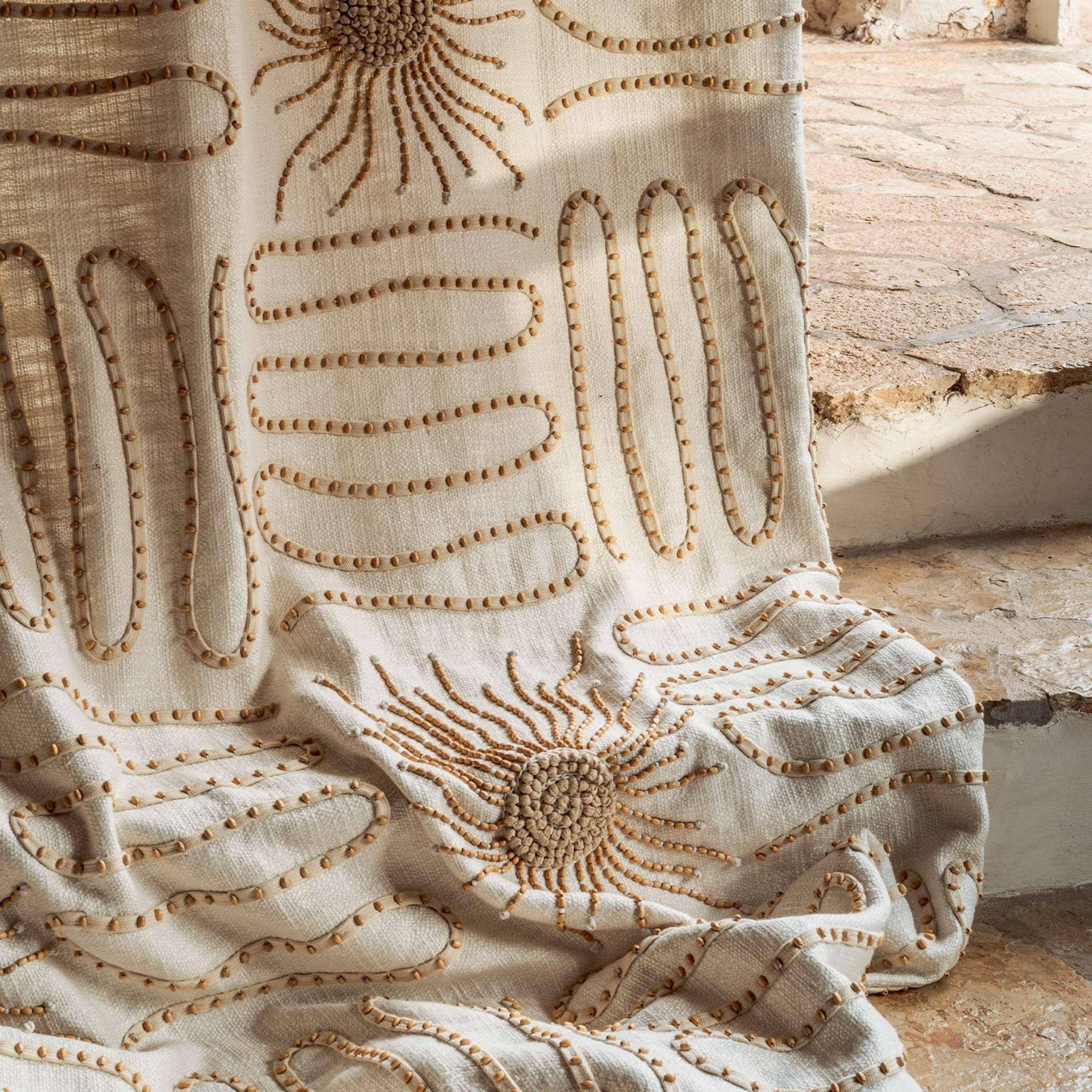 Cocteau-Inspiration, gestickte Holzperlen, dekorative Motive, großflächiges Design, handwerklicher Geist, für Vorhänge, matte Bandapplikation