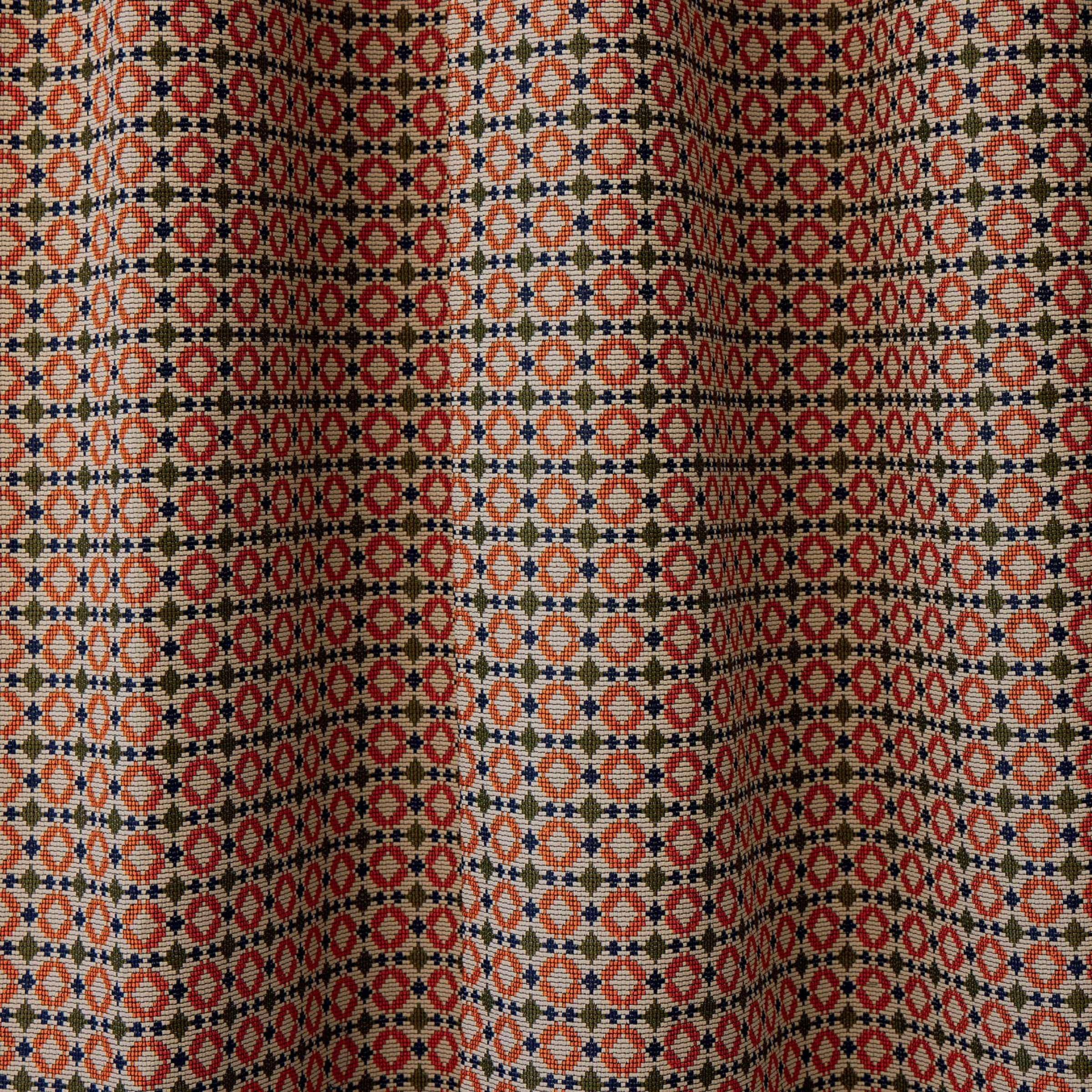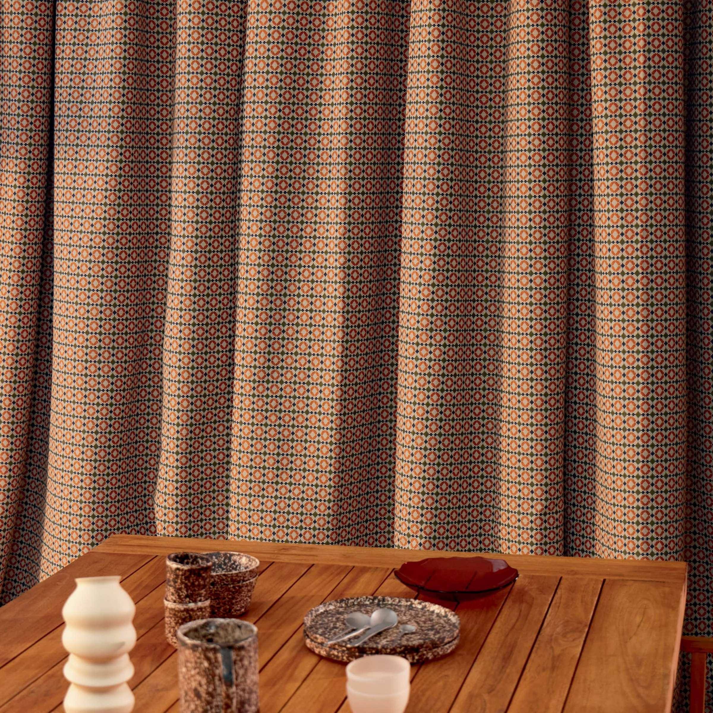 Inspiriert von Keramik, kleine geometrische Motive, ideal zum Koordinieren, Stoff für den Außen- und Innenbereich, flammhemmend