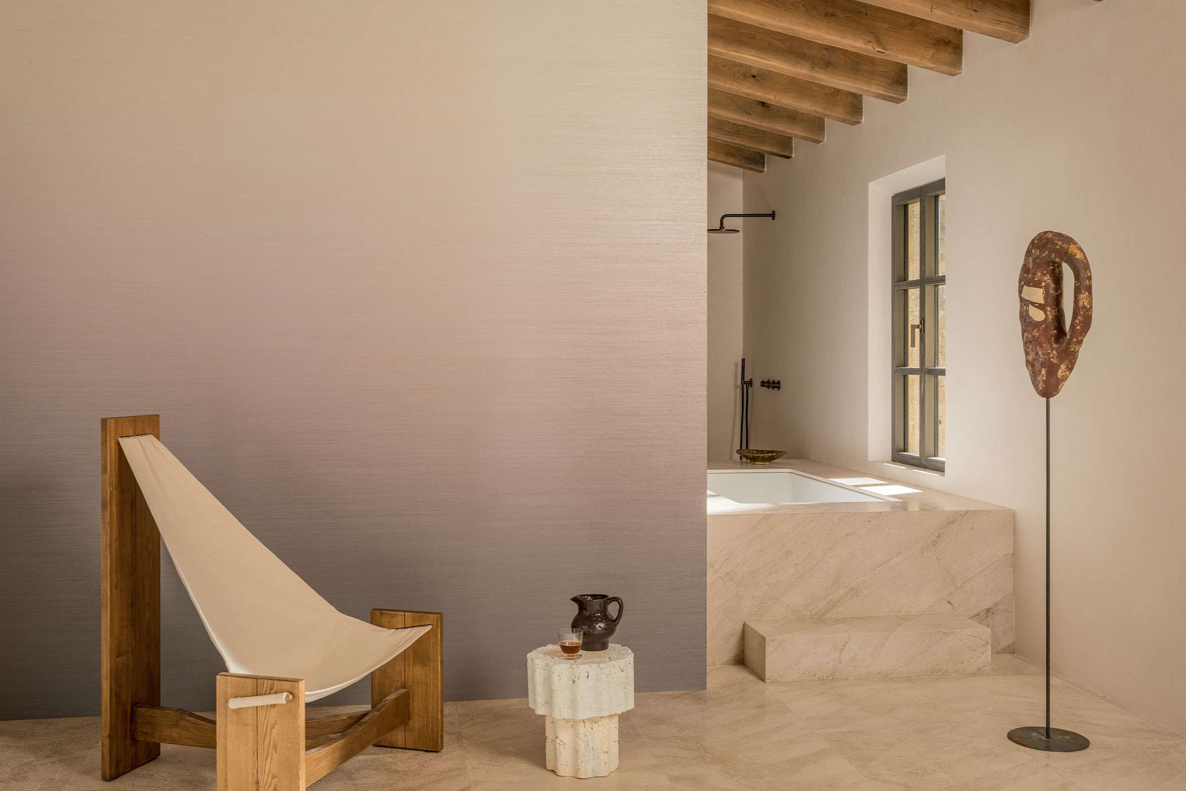 Der Farbverlauf schafft eine sanfte, beruhigende Raumatmosphäre – ideal für Wohnräume, Loungebereiche oder Spa‑ähnliche Zonen. Die subtile Materialstruktur und natürliche Farbpalette harmonieren besonders mit hellen Holztönen, weißen Wänden und weichen Textilien und verleihen dem Raum eine poetische Leichtigkeit