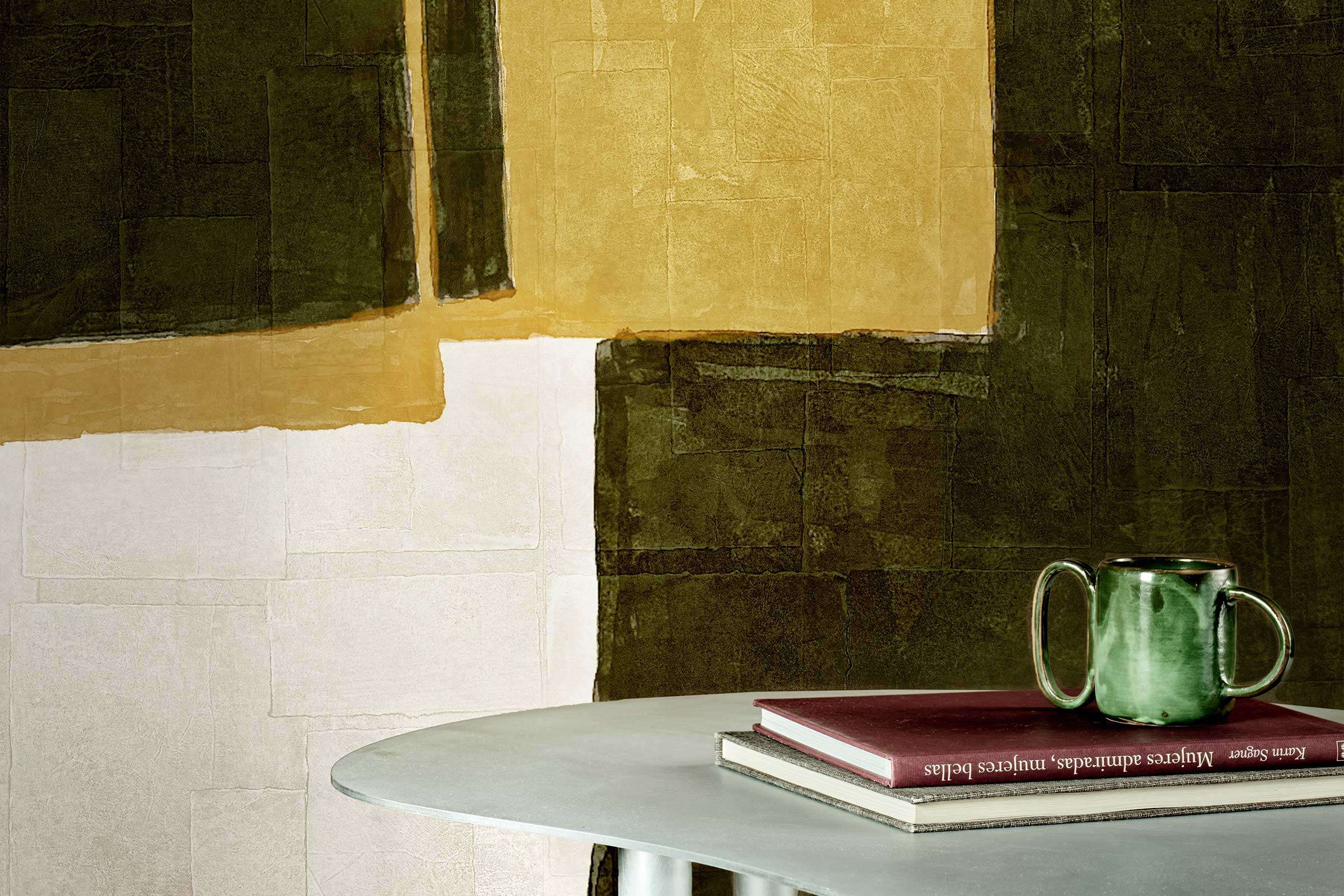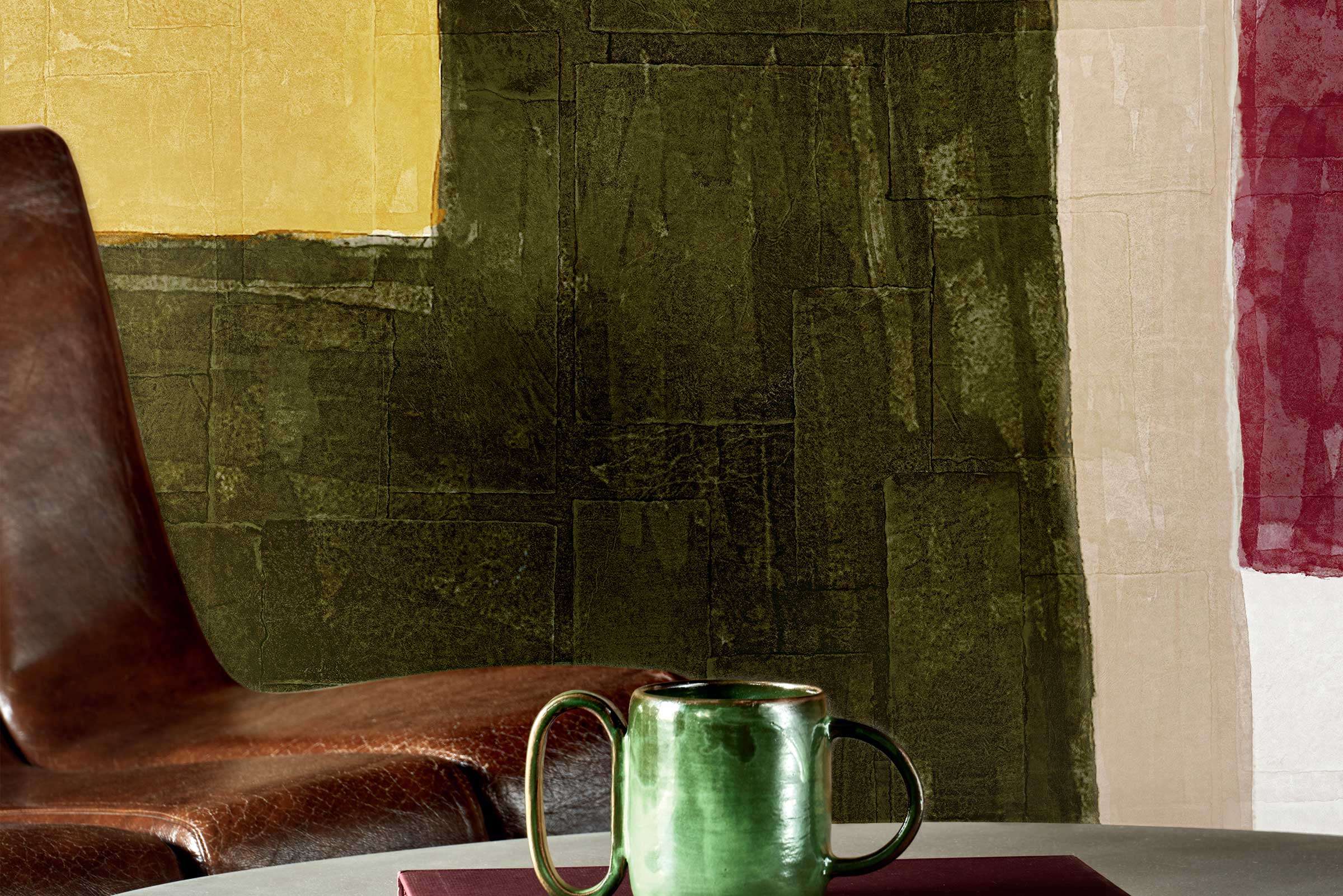 Die abstrahierten Farbfelder schaffen eine ruhige, künstlerisch inspirierte Wandästhetik – ideal für moderne Wohnwelten oder repräsentative Räume. Kombiniert mit warmem Holz oder Keramik entsteht eine raffinierte, harmonische Gesamtwirkung