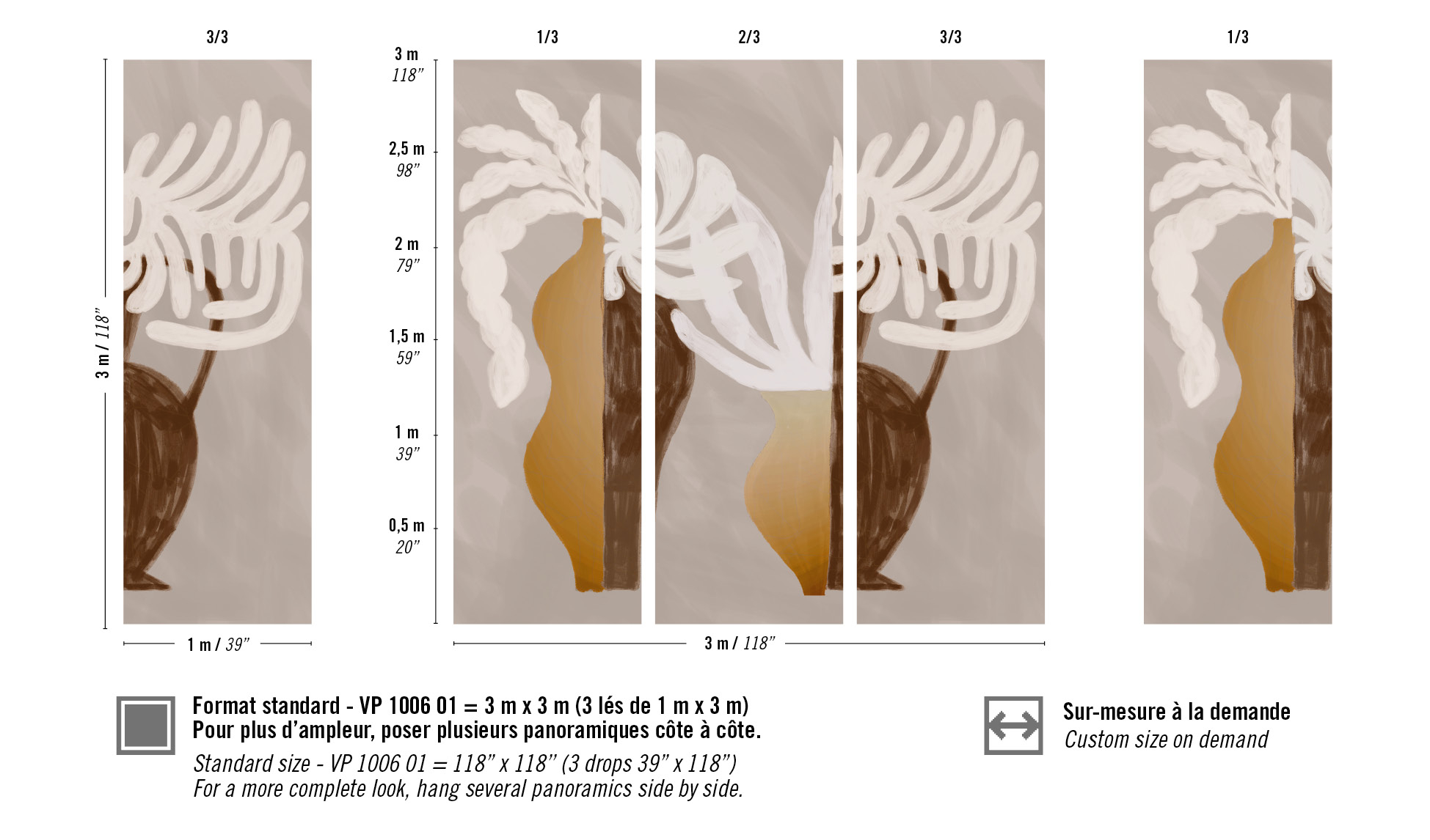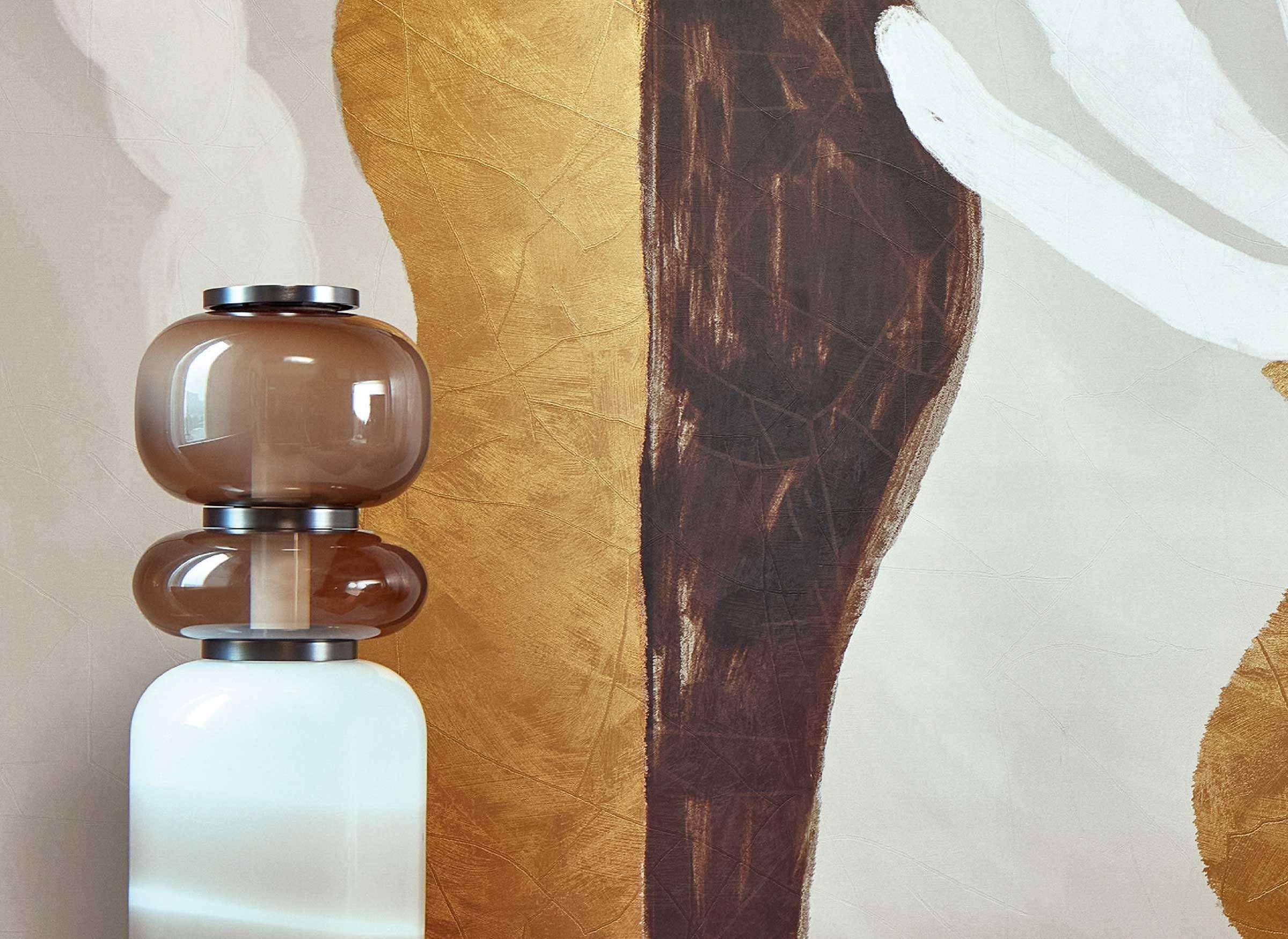 Die Panoramatapete Une certaine magnificence von Élitis aus der Kintsugi-Kollektion zeigt zwei kunstvolle Vasen mit Blumen und verleiht Räumen eine harmonische, elegante Atmosphäre. Die Tapete besteht aus geprägtem Vinyl mit goldfarbenen Rissen, die an die japanische Kunst des Kintsugi erinnern. Standardmaße: 3 m x 3 m, aufgeteilt in drei Bahnen à 1 m.
