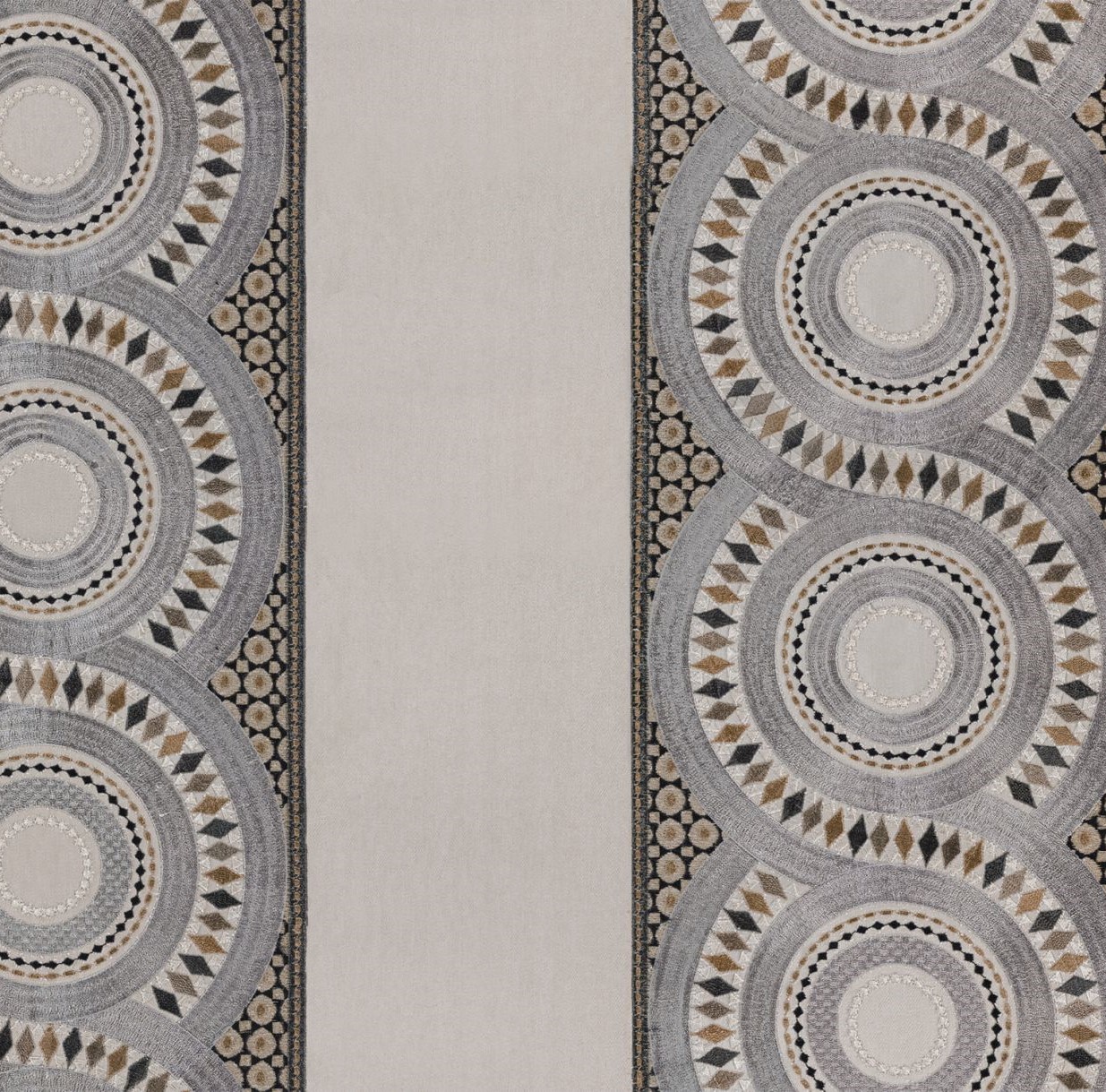 Die Inspiration für diesen hochattraktiven Dekorationsartikel bildeten die Mosaike der barocken Kathedrale von Monreale in Sizilien.Durch die meisterhafte und kunstvolle Stickerei auf dem noblen Baumwollfond entsteht ein faszinierendes Farbspiel, das die raffinierte Schönheit dieses Textils besonders betont. Klar und grafisch, setzt die Streifen-Ornamentik von FONTANA PRETORIA einen Akzent in jedem anspruchsvollen Interieur.