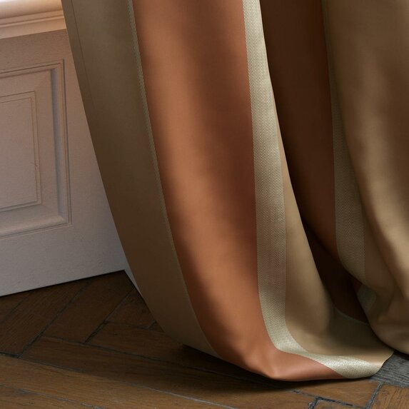 Charakteristisch ist das raffinierte Jacquardstreifen-Design, das durch seine klare Linienführung zeitlose Eleganz ausstrahlt. Gleichzeitig sorgt die Taftstruktur für ein lebendiges, leicht schimmerndes Farbspiel, das je nach Lichteinfall immer neue Facetten offenbart. Die feinen Garne und die sorgfältig abgestimmte Farbkomposition verleihen dem Stoff eine beeindruckende Tiefe und Dynamik.