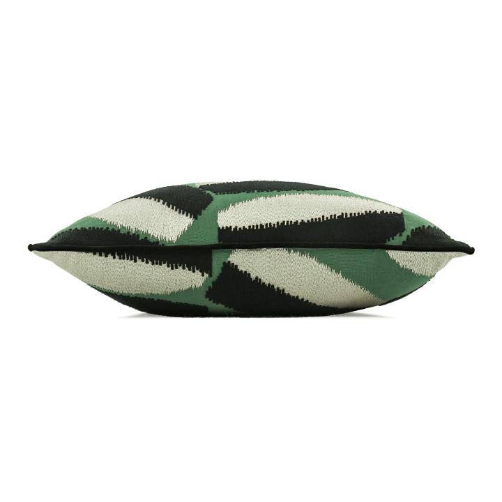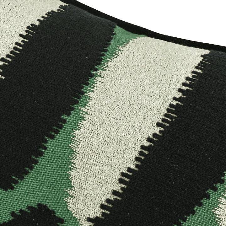 Charakteristisch ist die raffinierte Oberflächenstruktur: Durch die Kombination aus Crewel- und Satinstichstickerei entstehen abstrakte, ovale Formen, die dem Kissen eine besondere Tiefe und Lebendigkeit verleihen. Die Farbvariante „Malachite“ setzt dabei einen ausdrucksstarken, modernen Akzent und wirkt sowohl dekorativ als auch zeitlos elegant.