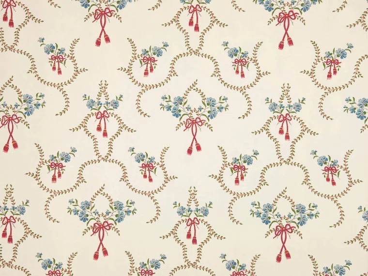 Der dekorative und vorhanggeeignete Stoff Les bleuets von Braquenie besteht aus 100% Baumwolle. Das Dessin zeigt ein reizvolles Louis‑XVI‑Muster mit kleinen stilisierten Blumen und Bändern, das klassische Eleganz und französische Raffinesse vermittelt.