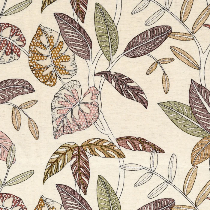 Dieses Gewebe zeichnet sich durch feine Handstickerei aus, die die lebendige Pracht tropischer Vegetation widerspiegelt. Jedes Detail des Designs ist das Ergebnis akribischer Handwerkskunst und kann jeden Raum verwandeln. Die Textur verbindet die Natürlichkeit von Leinen mit der Weichheit der Viskose, was einen Eindruck von hoher Eleganz und kunstvollem Ausdruck erzeugt.