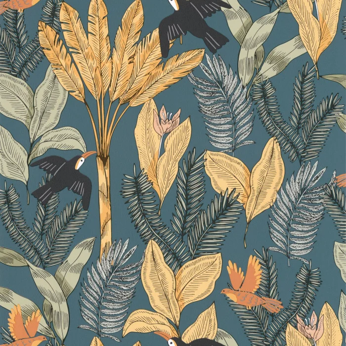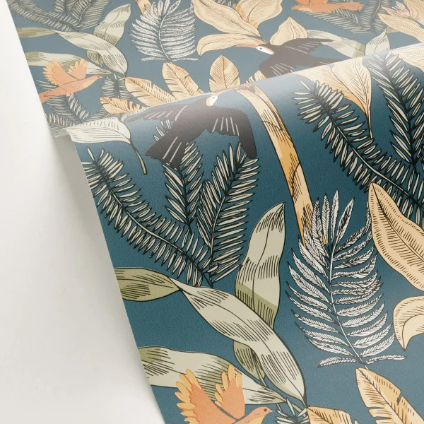 Wir begeben uns auf eine Entdeckungsreise durch einen tropischen Dschungel, in dem sich auch große Feuilletons und andere Tukane tummeln. Zur Auswahl stehen die Farben Kaki oder Blau, aber immer in lebendigen und leuchtenden Tönen.