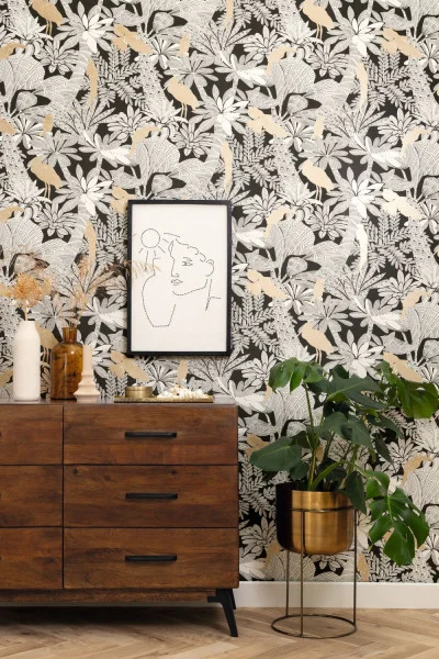 Die üppige Natur blüht in diesem leuchtendsten aller Motive. Vergessen Sie die Vorstellung, dass Schwarz und Weiß trist sind. Hier werden sie mit goldenen Akzenten kombiniert, die den Raum zum Leuchten bringen.