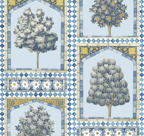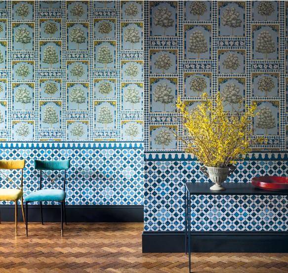 Sultan's Palace vereint zwei von Martins einflussreichsten Designelementen: traditionelle britische Motive und orientalisch inspirierte Handwerkskunst. Eine Kartusche mit englischen Bäumen ist das Herzstück dieses atemberaubenden Patchworks, umgeben von einem Mosaik aus Steingutfliesen, das von der Fassade der Wazir-Khan-Moschee in Lahore mit ihren hochdekorativen Bögen und komplizierten botanischen Fliesen inspiriert ist. Dieses reiche Design ist in den königlichen Farben China Blue und Ocker, Print Room Blue und Duck Egg sowie Gold und Spice erhältlich und kann mit Zellige und Zellige Border kombiniert werden.