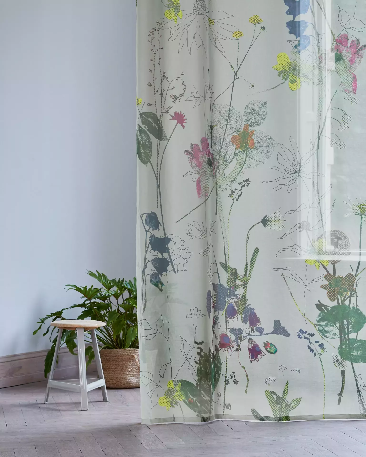 Transparenter Vorhangstoff; Gepresste Wiesenblumen, frei und locker skizzierte Blüten und Käfer treffen sich zu einem Stelldichein. Das grafische Raster legt sich wie ein Schleier über die Blüten und Blätter und verleiht dem digitalbedruckten Stoff einen zeitgemässen Look mit poetischem Ausdruck.