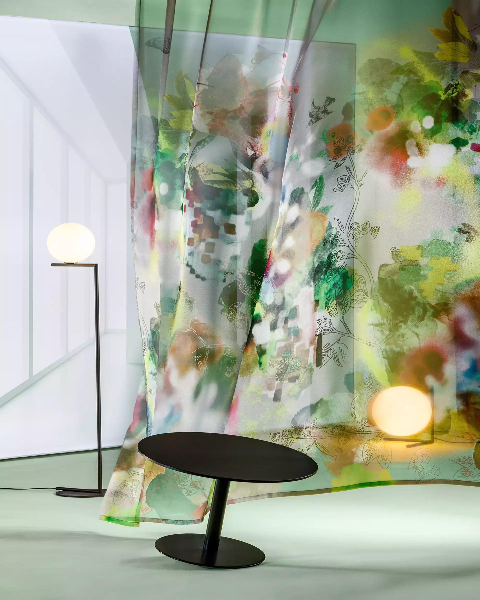 Transparenter Vorhangstoff; Transferdruck auf hochwertigem, crêpeartigem Voile. Traumwandlerisch gruppieren sich grosszügige Formen zu einem fantasievollen, schwebenden, floralen Bouquet. Das sinnliche Farbenspiel verzaubert den Raum und mit ihm den Betrachter. Direktes Sonnenlicht verwandelt den Voile zu einem glitzernden Tagtraum.