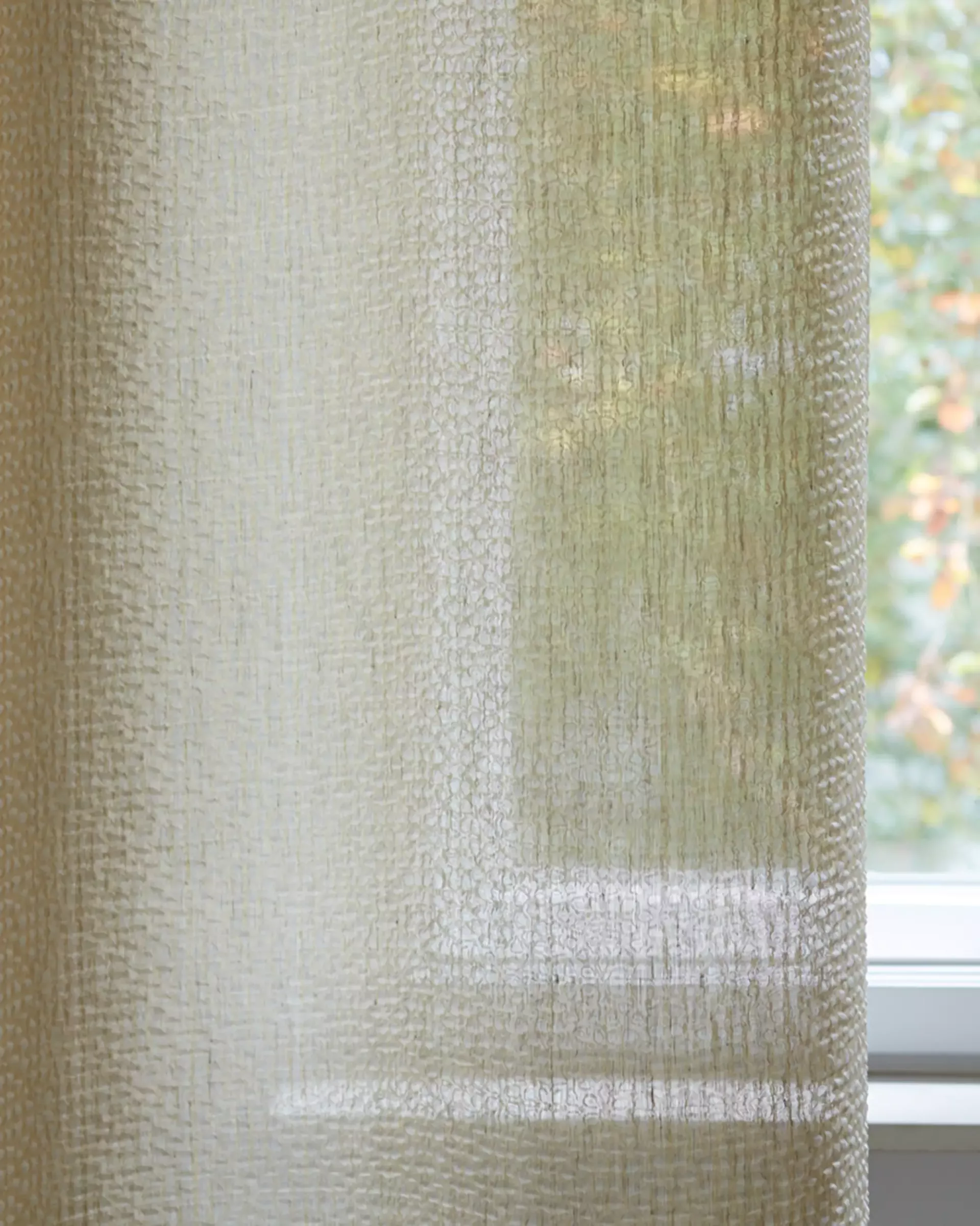Halbtransparenter Vorhangstoff; Das ornamentale Dessin wirkt durch das dreidimensionale Relief wie aufgebrochen und ist erst auf den zweiten Blick erkennbar. Die natürliche Optik, der weiche Griff, das subtile Fil-à-Fil Spiel und der reizvolle Matt-Glanz-Effekt zeichnen diesen eleganten Artikel aus.